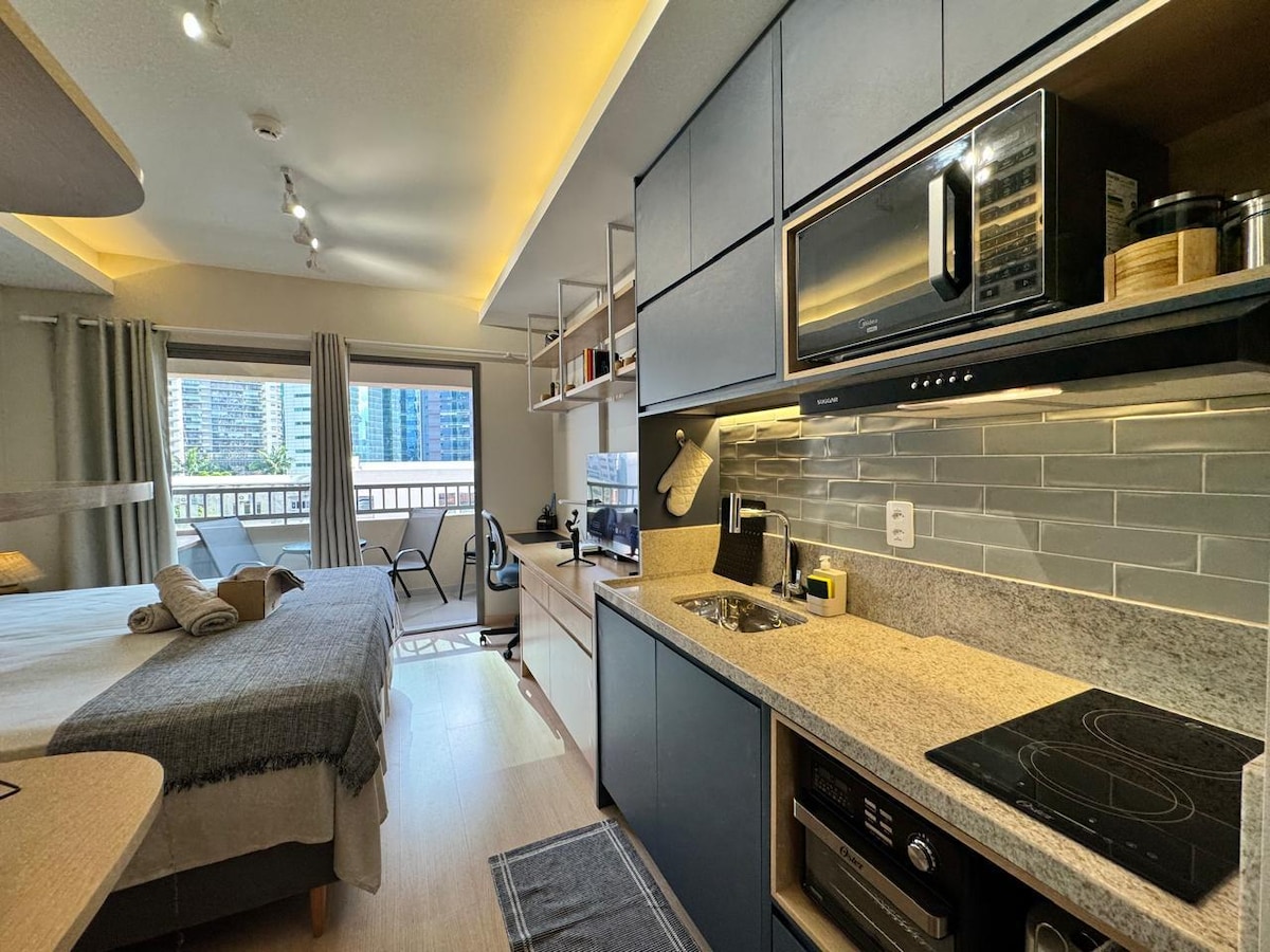 Studio no melhor ponto da Vila Nova Conceição . Decorado e equipado com todos os utensílios de cozinha ( nespresso , microondas , cooktop, frigobar retrô) . Tv smart , ar- condicionado . Enxoval completo , cobertor , edredon, toalhas . Mesa de refeição/trabalho . Varanda integrada . Iluminado e arejado . Armários . Self check-in. Mercado autônomo ,área fitness , jacuzzi , churrasqueira , área gourmet externa . Bairro repleto de restaurantes . Próximo ao Parque Ibirapuera , Hosp. Vila Nova Star