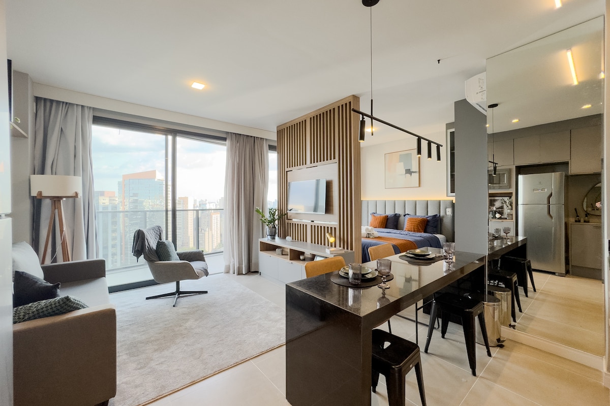 Descubra São Paulo a partir do nosso estúdio moderno na vibrante Vila Olímpia. Perfeito para até 2 pessoas, este loft elegante conta com espaço de trabalho dedicado, cozinha completa e um aconchegante sistema de projeção para filmes e séries. Aproveite o acesso exclusivo à piscina na cobertura, com vista panorâmica da cidade, e a uma academia de alto padrão. Ideal para viajantes a negócios ou casais que buscam uma estadia premium na cidade.