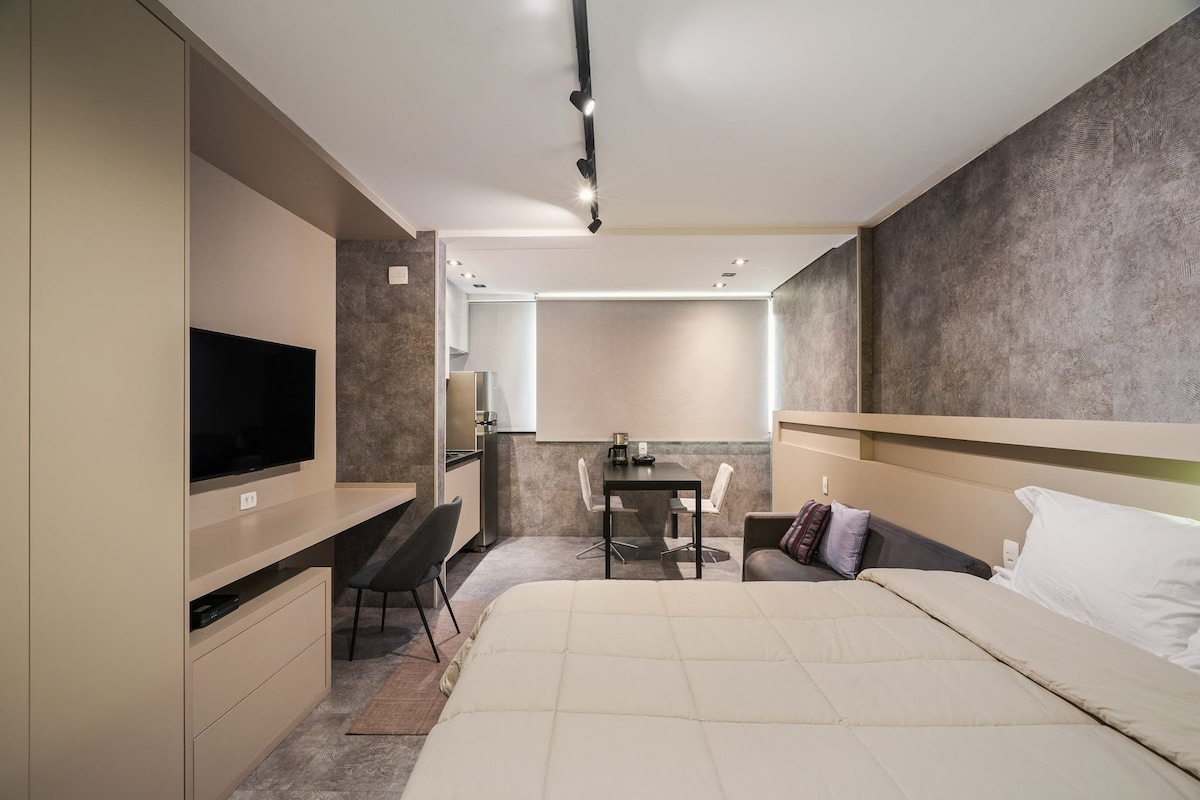 Studio sofisticado e moderno, na melhor localização do Itaim Bibi, em condomínio de luxo novíssimo e moderno próximo ao Parque Ibirapuera e Avenida Faria Lima. Ambiente projetado para ser sua casa em São Paulo. Os Hospedes tem acessos às áreas comuns do condomínio. - Lavanderia, piscina, academia completa, salão de jogos, share space com lounge, sala de reunião, share working, espaço de lazer e recepção 24 horas. - Ar condicionado split - wifi 300 mbps - cozinha completa - cama mesa e banho