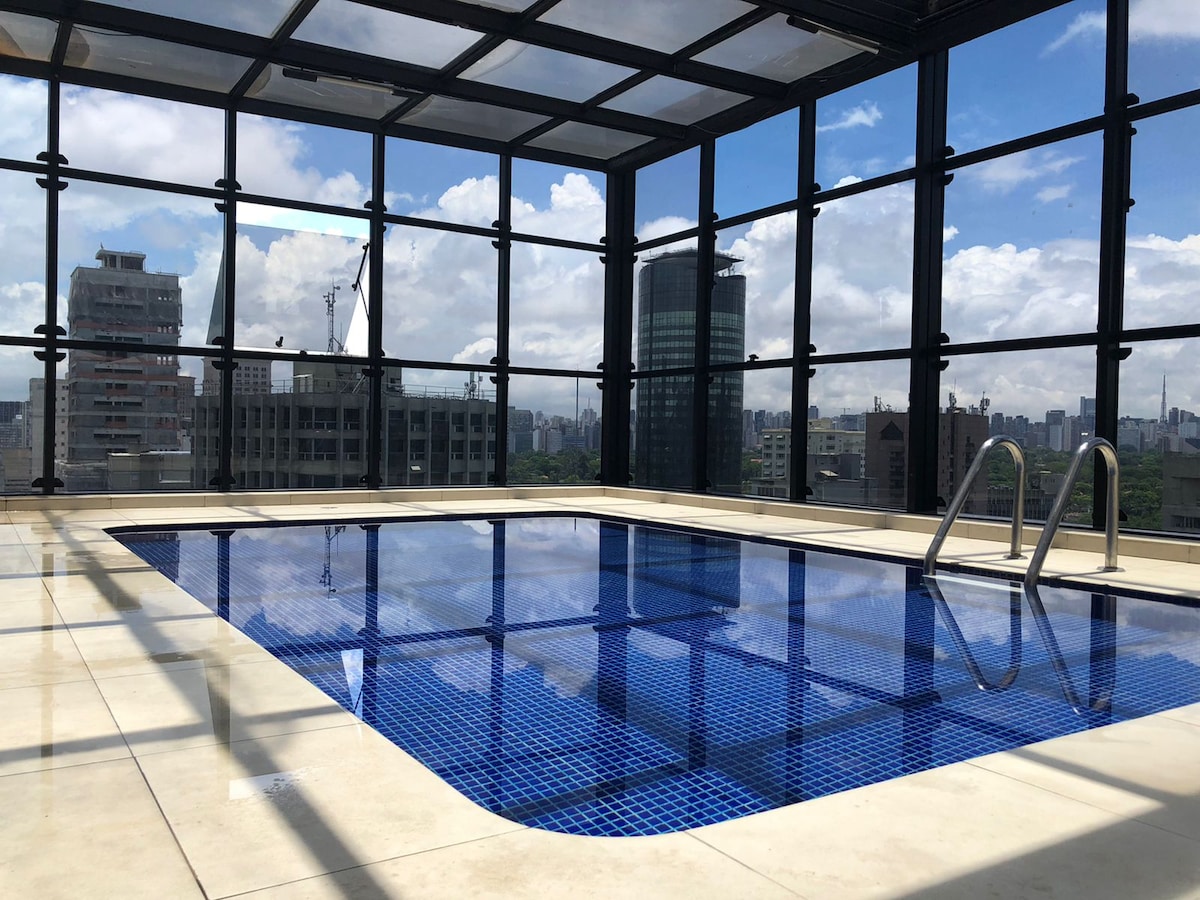 Extremely well located with maid service and cleaning every day. Excellent pool, gym and sauna on the roof. Restaurant on the ground floor. Valet parking. Surrounded by the most popular and award-winning restaurants and bars in São Paulo. Bright and ventilated apartment. Living room with balcony, nice sofa for watching television, writing desk and dining table for 4 people. Television in the living room, bedroom. Kitchen with all utensils. 2 parking spaces.
