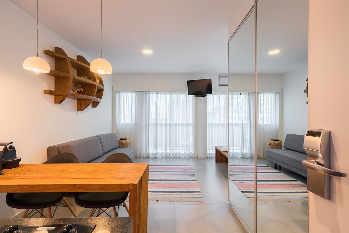 Apartamento decorado e dividido em dois ambientes, com sala de estar e dormitório, com 32m². Unidade equipada com cozinha americana contendo fogão eletrico tipo cooktop, microondas, frigobar, wifi e espaço de trabalho. Temos estacionamento com manobrista. Estamos localizados no sofisticado bairro da Vila Olimpia, com facil acesso as principais avenidas como Faria Lima, Bandeirantes e Luiz Carlos Berrini. Há 05 km do aeroporto de Congonhas, e proximo aos shopping Vila Olimpia e JK.