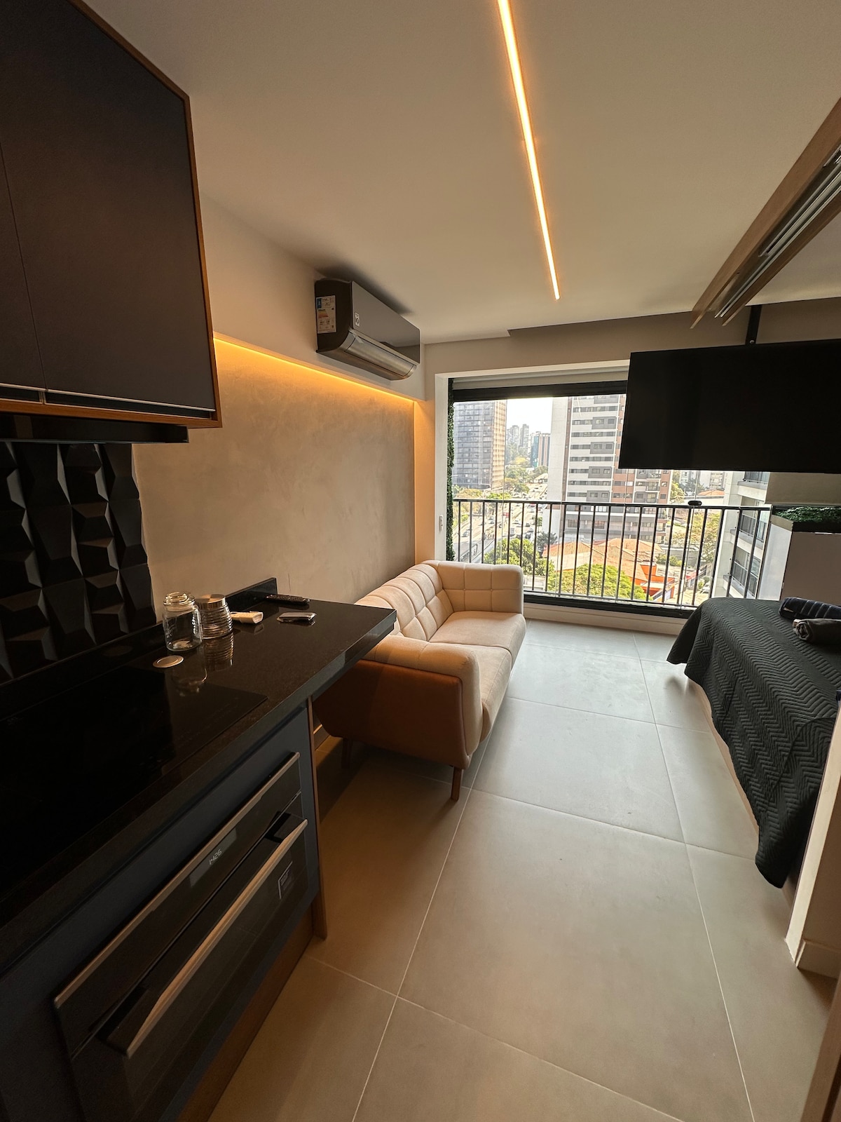 Relax in the best location of São Paulo, between Jardins and Pinheiros. This newly opened studio is a 5-minute walk to the Oscar Freire subway station, in a new building with all the infrastructure for a quiet and comfortable stay. It is on top of a bakery with artisan bread and across the street from a supermarket. The building has coworking and coliving space, laundry room, gym, rooftop pool, and a 24-hour doorkeeper. Wi-Fi 450Mbps.