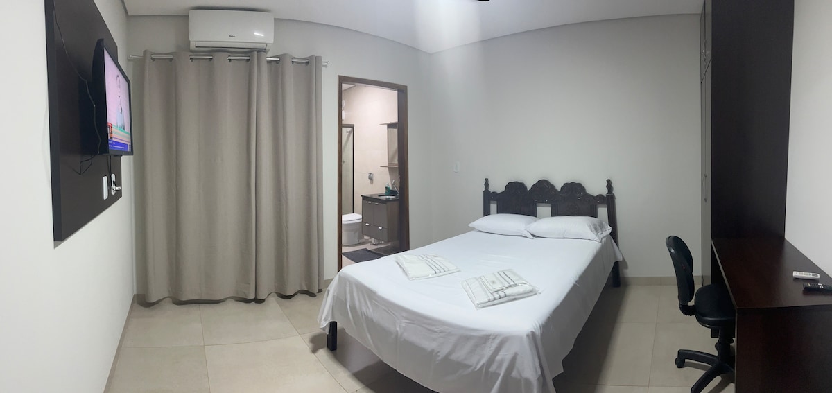 Localização privilegiada em relação ao Cerrado Brasil, Centro de Convenções de Dourados, HU, a 300 metros do ponto que passa ônibus direto para às universidades (UEMS e UFGD - Unidade 2) etc. Relaxe neste espaço calmo e cheio de estilo. Praticidade e conforto são os requisitos dos itens que irá encontrar, a começar pelo colchão e ar condicionado. O filtro de água, a geladeira 340L e o fogão de indução fazem convite a cozinhar, fazer um café/chá, preparar um tereré, típica bebida Guarani - MS.