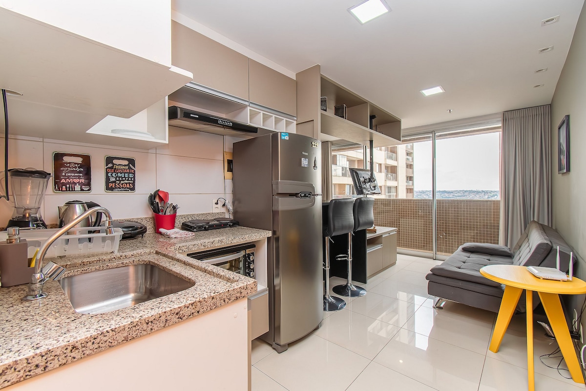 Luxurious apartment with panoramic views and direct access to DF Plaza Shopping. The bedroom has a queen bed, a living room with a 55" Smart TV, and a fully equipped kitchen and bathroom. Prime location: restaurants, supermarkets, and metro nearby. The condominium features an infinity pool, gym, workspace, and more. Fast Wi-Fi, private parking, and 24-hour security. It is ideal for couples, professionals, and discerning tourists. Peaceful environment. Experience the best with sophistication.