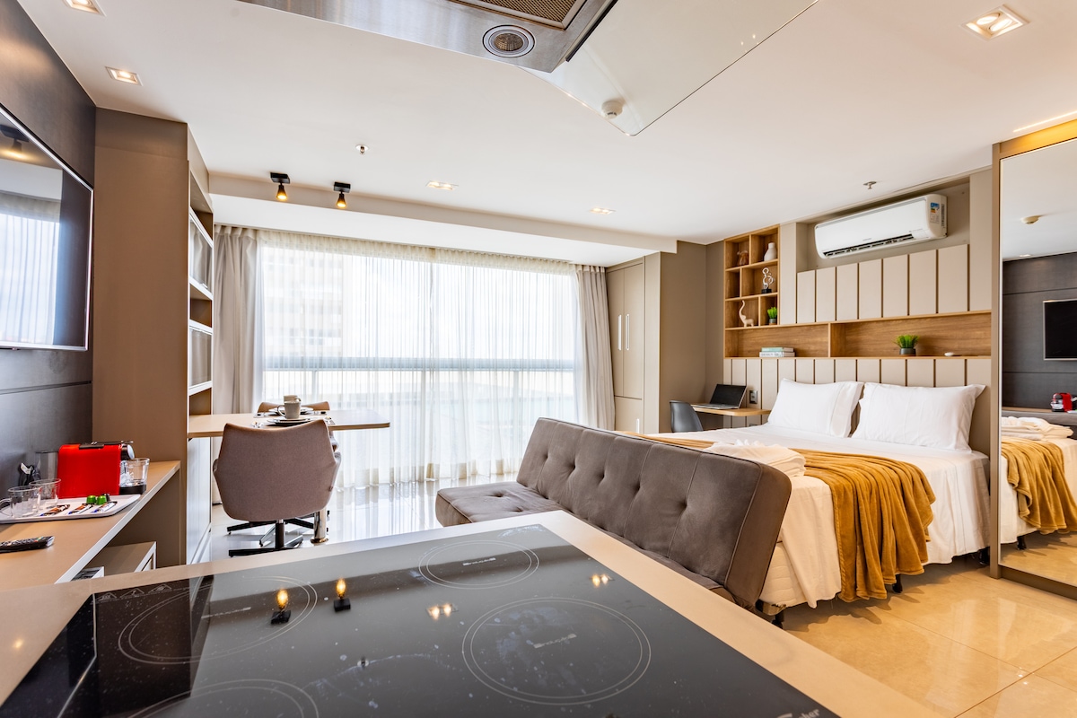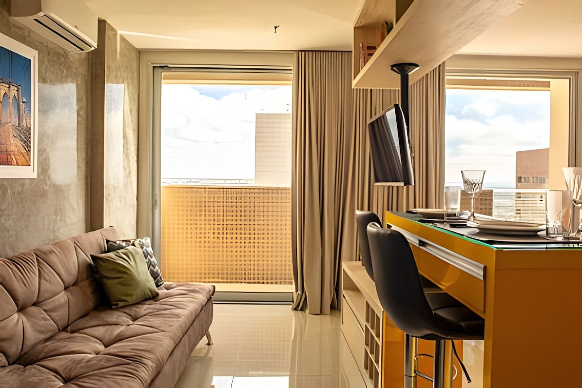 Luxurious apartment with panoramic views and direct access to DF Plaza Shopping. The bedroom has a queen bed, a living room with a 55" Smart TV, and a fully equipped kitchen and bathroom. Prime location: restaurants, supermarkets, and metro nearby. The condominium features an infinity pool, gym, workspace, and more. Fast Wi-Fi, private parking, and 24-hour security. It is ideal for couples, professionals, and discerning tourists. Peaceful environment. Experience the best with sophistication.