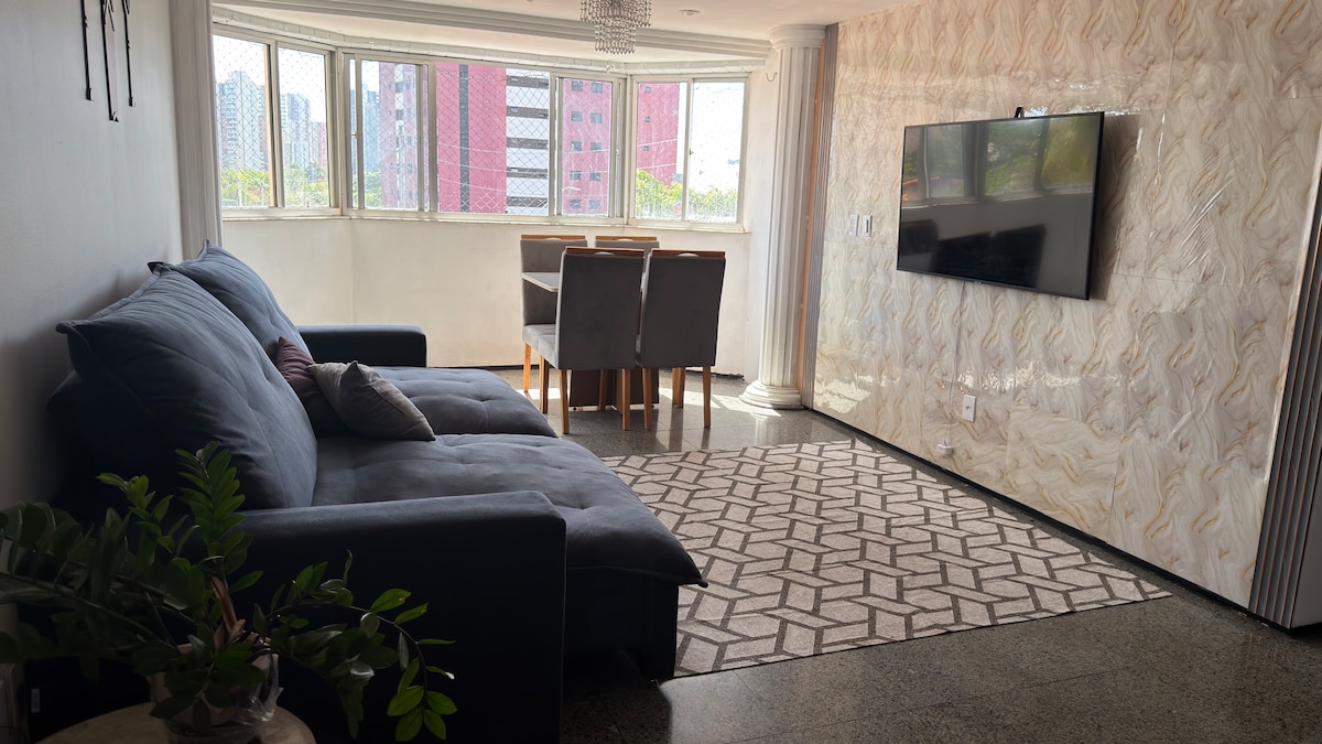 Apto de 3 quartos , sendo uma suíte,com uma varanda incrível COM VISTA PARA O MAR. Nosso espaço foi pensado para proporcionar conforto e bem estar aos nosso hóspedes. Conta com Smart TVs, Wi-Fi 200MB, Netflix, ar condicionados em todos os ambientes, água quente nos chuveiros, cozinha equipada com itens básicos que você precisa para o preparo de refeições em família. Possui, ainda, VAGA DE GARAGEM.