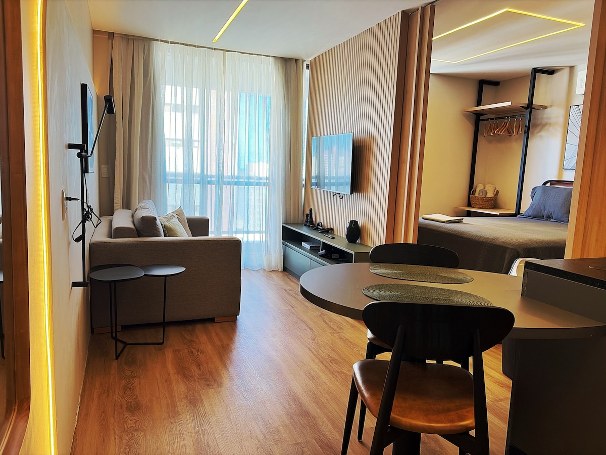 STUDIO COM UM ROOFTOP ESPETACULAR Planejado para oferecer uma estadia prática e aconchegante para clientes exigentes. -Cama de casal QUEEN Premium e enxoval. -TV 58” e canais a cabo com Filmes e Premiere para não perder os Jogos de seu time. -Cozinha com Cafeteira a cápsula Fogão,Microondas,Geladeira Duplex,Sanduicheira,Liquidificador,Purificador de Água Gelada, Ayrfrier; -Banheiro Moderno com Ducha de Água Quente revigorante, Secador de Cabelo. -Varanda com Mesa e cadeiras confortáveis.