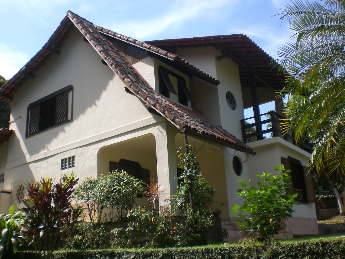 Grande maison coloniale avec piscine, entourée d' un jardin tropical, à flan de coline, avec vue dégagée sur le Cristo Redentor et le Pain de Sucre. Grands salons au rez de chaussée, salle à manger, cuisine et sanitaires. Deux suites avec terrasse , une suite sur le patio et une chambre. Un jardinier est présent durant la semaine pour l'entretien du jardin et de la piscine.