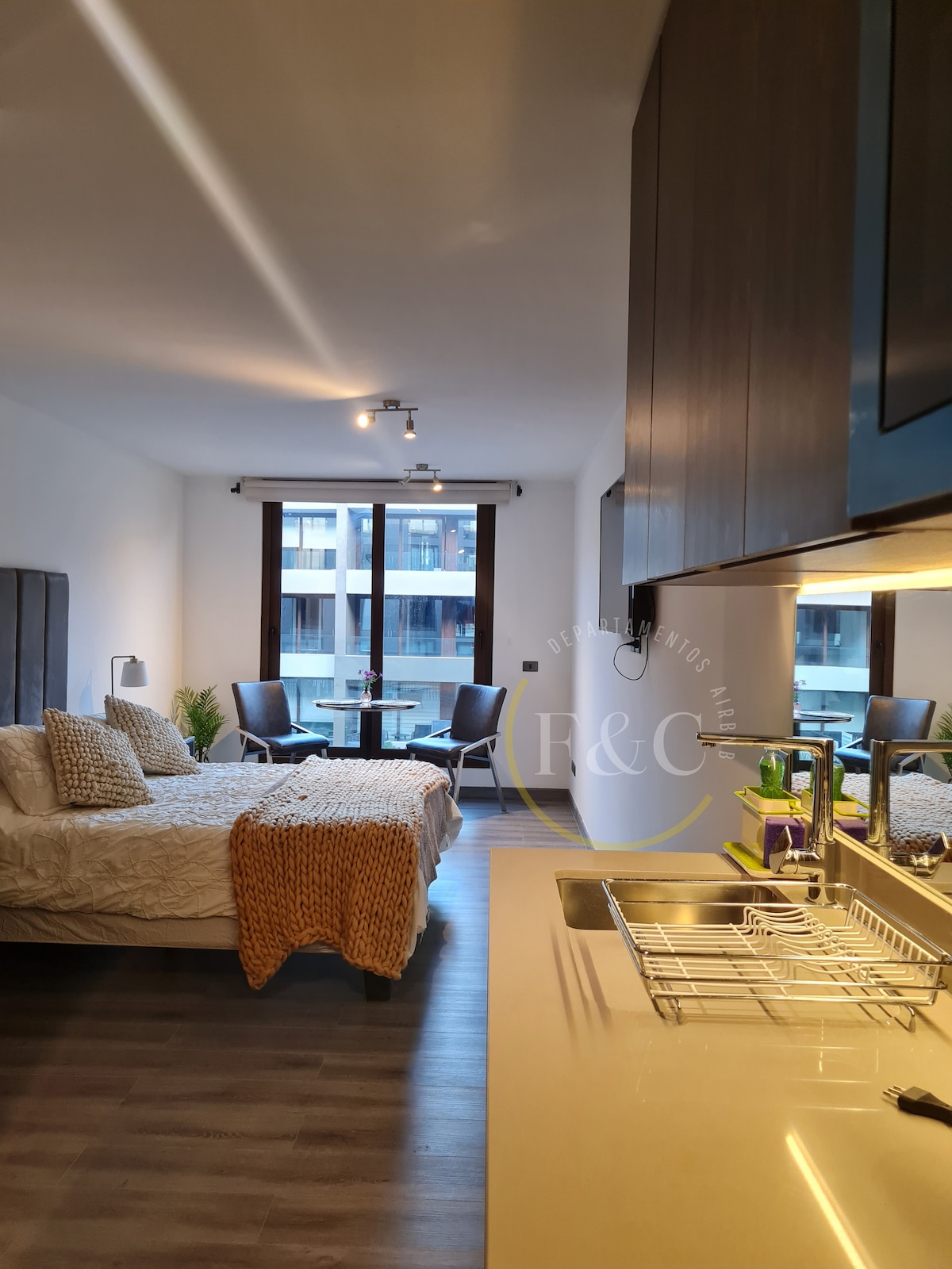Departamento nuevo, elegante, con ventanas termo panel , moderno y tranquilo. Ubicado en el casco histórico de Santiago, ideal para descanso tras la jornada laboral. En el sector encontrarás restaurantes y bares a pocos pasos. Cercano a metro y locomoción pública. Perfectamente equipado para que te sientas como en casa. Lee las reseñas de nuestros huéspedes para que nos conozcas un poco más Departamento en segundo piso, con vista a piscina en patio interior y cuenta con ascensor.