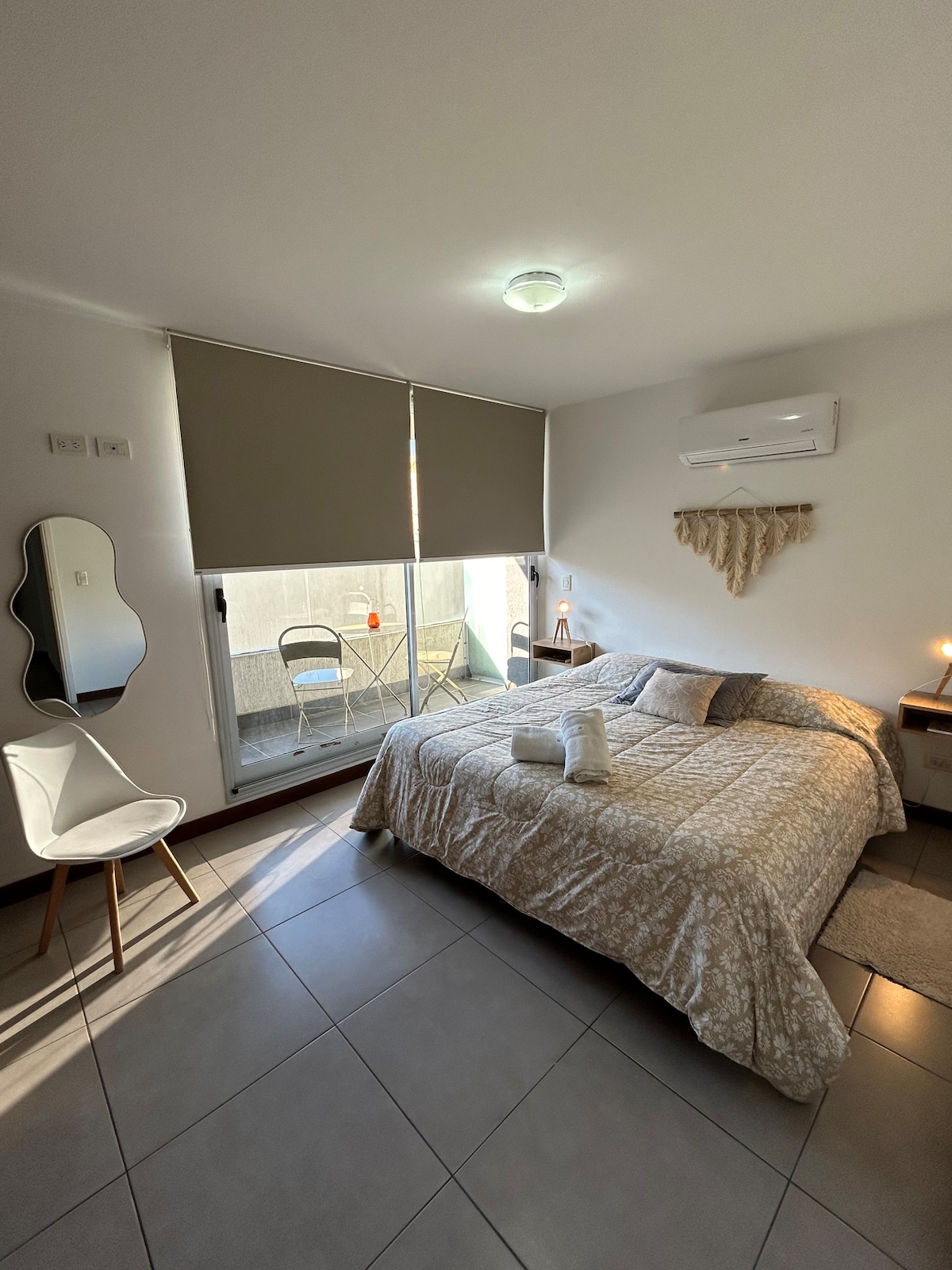 Relax in this divine brand new space, renovated with style, quality and design. Optimal location in a quiet centric residential neighborhood surrounded by markets and vegetation. We highlight its proximity to our large San Martin park, ideal for exercising and to known gastronomic Avenue. High-end Simmons brand new king box spring, to rest comfortably. On a second floor with a balcony. All rooms have windows Bikes available Self check in with unique code 2 Air conditioned with hot-cold split air