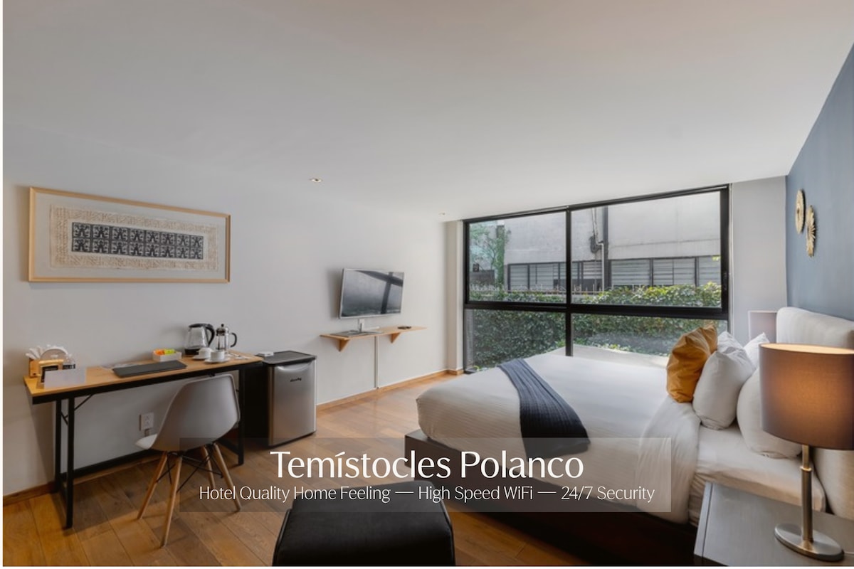 Work meets style in the heart of Polanco, steps from Masaryk Ave and Lincoln Park. This refined apartment offers a full kitchen, high-speed Wi-Fi, a Smart TV, and a peaceful workspace. Surrounded by executive offices, top restaurants, and cultural landmarks, you're perfectly positioned for business and after-hours dining. Enjoy a polished, productive stay with the comfort and convenience you need in Mexico City’s premier business district.