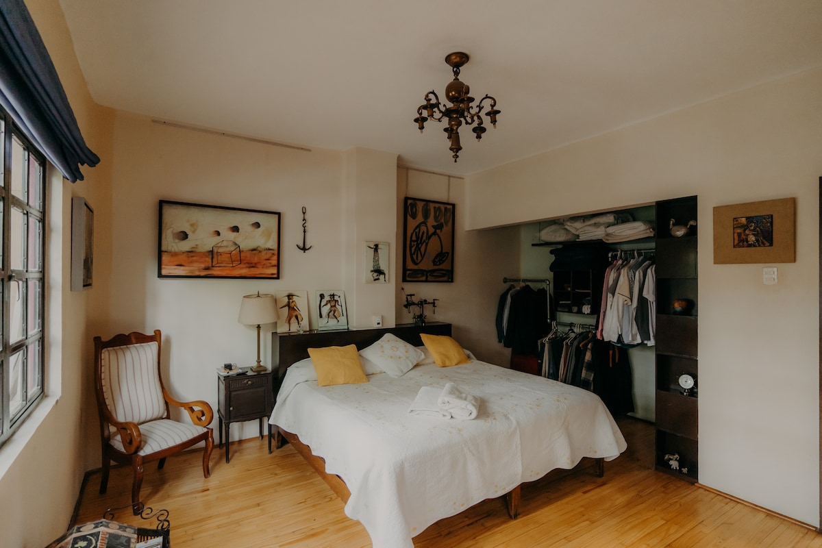 "Mexican traditions", located in a Porfirian building in Roma Norte, decorated with references to Mexican traditions. It has: spacious and equipped bathroom; washing machine strategically located; kitchen equipped with grill, microwave, and refrigerator; dining room with table and chairs for four people; living room with sofa and chairs to relax. Master bedroom with king-size bed, closet, TV and air conditioning. Access to the garden from the living room and bedroom. Ideal for extended stays.