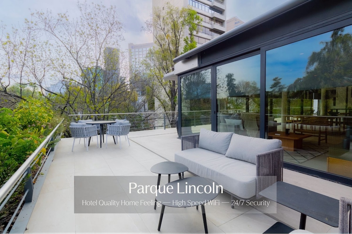 At Terré Hospitality, we combine hotel comfort with the privacy of a boutique apartment. Located in the heart of Polanco, Mexico City’s most exclusive area, you’ll be surrounded by renowned restaurants, luxury shops, parks, and museums. Set on a quiet street, this 80 m² apartment features modern design, a private laundry area, and comfortable space for up to 5 guests.