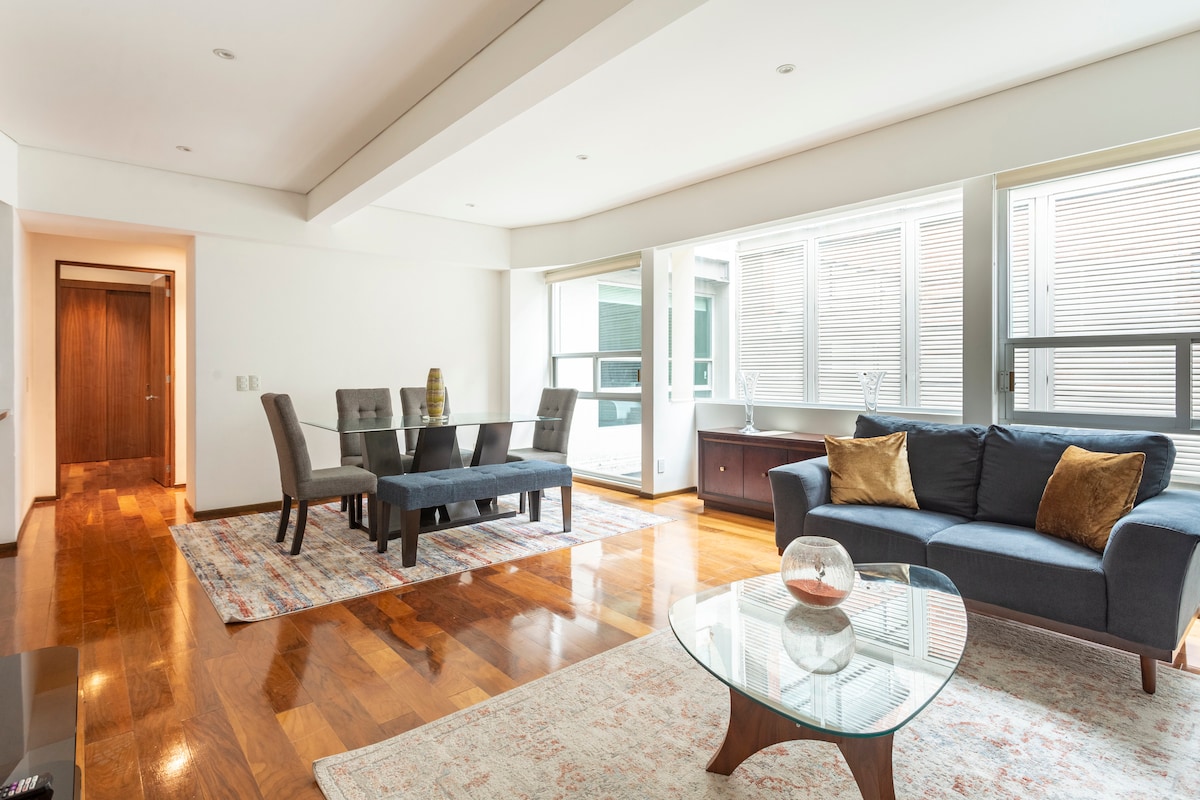 Minimalist urban apartment in the heart of Polanco. As you come inside, you will be immersed in a comfortable atmosphere.The peaceful bedroom is characterized by generous ceilings, king size bed with luxury bedding and a complete bathroom. An extra half bathroom, a spacious living and dining room with fully equipped open kitchen. Natural light and ventilation throughout the spaces. The location is unbeatable, in a safe and calm street in Polanco, the most exclusive neighborhood in Mexico City.