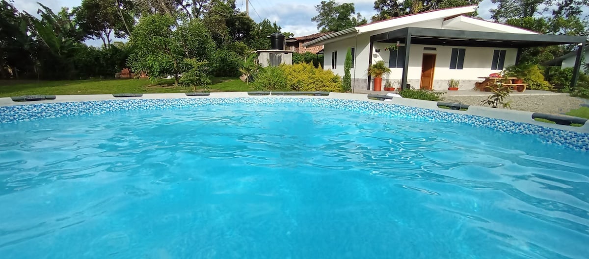 Rural and private setting, not shared with other guests. Located on the Montenegro–Quimbaya road, Km 3. Beautiful house, equidistant from Panaca (16 km), Parque del Café (13 km), and Los Arrieros (1.5 km). Exclusive rental: 5 to 17 guests. Great weather, fresh air, views, pool, cool house, wide halls, hammocks, gardens. BBQ, full kitchen, grill barrel, ping pong table. El Edén Airport: 30 km. THE ROAD HAS 600 UNPAVED METERS UNTIL YOU REACH THE FARM.