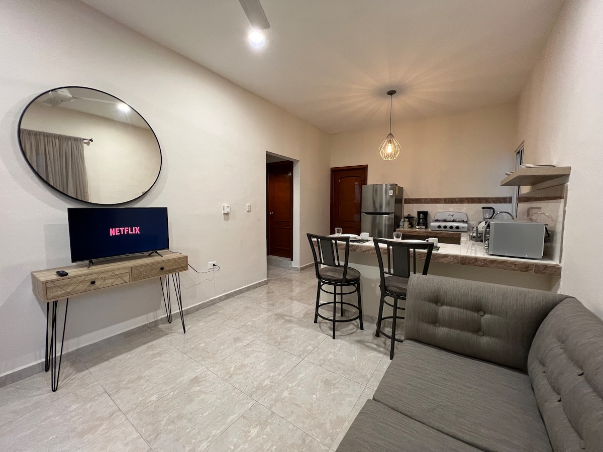 The most cozy place, with all the comfort you will need for your stay. Two blocks away from 5th Avenue, the beach, the famous, open mall, Paseo del Carmen, as well as the ferrys to Cozumel. Modern, new furniture offering comfort, and a moment to relax. Enjoy the amenities such as a cup of coffee in the balcony with amazingly comfortable chairs, as well as a big kitchen for cooking lovers. The best moments in the common pool at the roof top with an ocean view, just beautiful. 70 MEGAS wifi