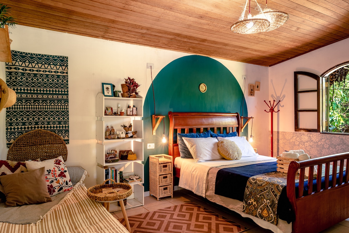 O convite do Chalé Bem-querer é viver momentos de conexão total com a Natureza. Acordar com o canto dos pássaros, sentir a brisa na pele, colher fruta no pé, caminhar descalço pela grama, curtir uma fogueira sob o céu estrelado. • Atividades ao ar livre | slackline, frescobol, trilha na mata, fogueira, jardins, mirante, rede, jogo da velha gigante • Varanda ampla integrada com a natureza e vista para a mata • Farm office | Wi-Fi exclusivo e espaço adequado • Churrasqueira e lareira eco.