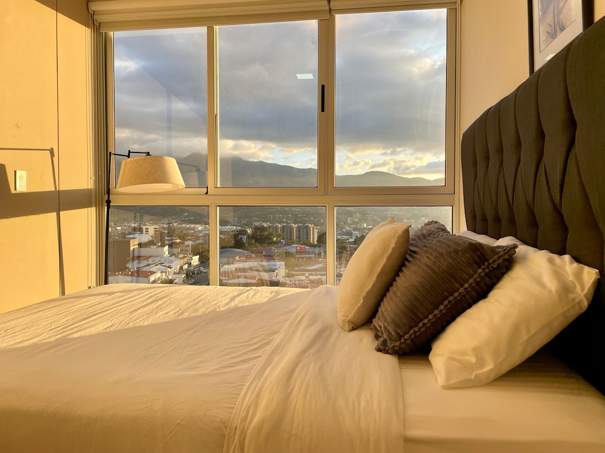 Wake up 22 floors above San José with an uninterrupted 180° view of La Sabana Park, the Central Valley mountains, and the city skyline. This modern skyline loft pairs hotel-level comfort with the freedom of a private apartment—perfect for business trips, staycations, or digital-nomad escapes.