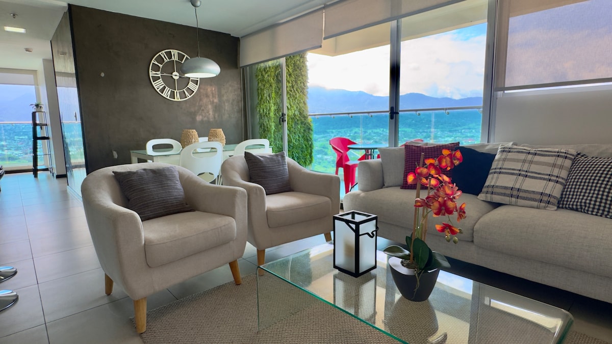 Lets chat for a FREE early check in 24/7 security, ONLY building to park a PICK-UP Get up in the morning to the most magnificent view of Irazú Volcano, enjoying a cup of the most amazing costarican gourmet coffee. Get on to the amenities to enjoy a relaxing session in the Sauna or Hot Tub, put in a day of work then go out for a 2 minute walk to a delicious restaurant finally back home a comfy queen bed will welcome you. Tons of public transport available including a small train station.