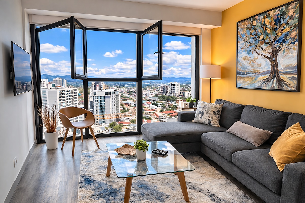 ? Stunning & Spacious 1BR/1BA Condo! Perfect for medical tourism, remote work, business, or family stays, in the most exclusive area of Escazú! Enjoy breathtaking Central Valley & mountain views ?, just minutes from Multiplaza Mall, top dining, pubs, shops & artisanal cafés. ? Private parking, 24/7 security, elevator & stairs. Plus, relax with a pool, gym & lightning-fast 100Mbps WiFi! ??♂️? Cozy comfort & convenience—experience it all and leave your journey with us !- AC in master BR ✨