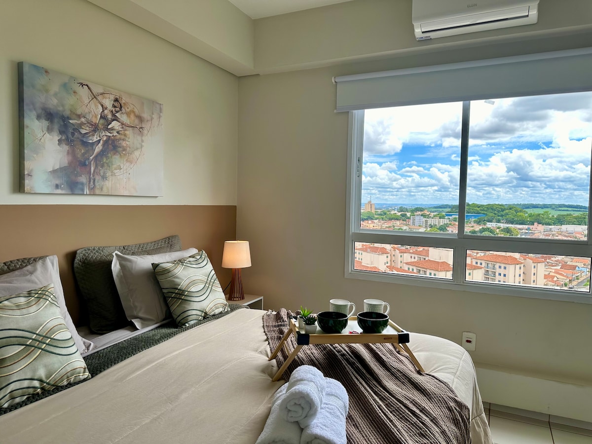Relaxe neste lugar único e tranquilo. Studio completo com Wi-Fi, smart Tv, AC, Alexa, utensílios de cozinha, cafeteira, filtro de água, secador de cabelo, ferro de passar e tudo mais para o seu conforto. Você pode optar por 2 camas de solteiro ou 1 cama queen. Desfrute das áreas comuns como piscina, elevador, estacionamento, lavanderia, portaria 24h, sala para estudos ou reuniões e espaço gourmet. Excelente localização, próximo ao Hospital São Francisco e Faculdade UNAERP.