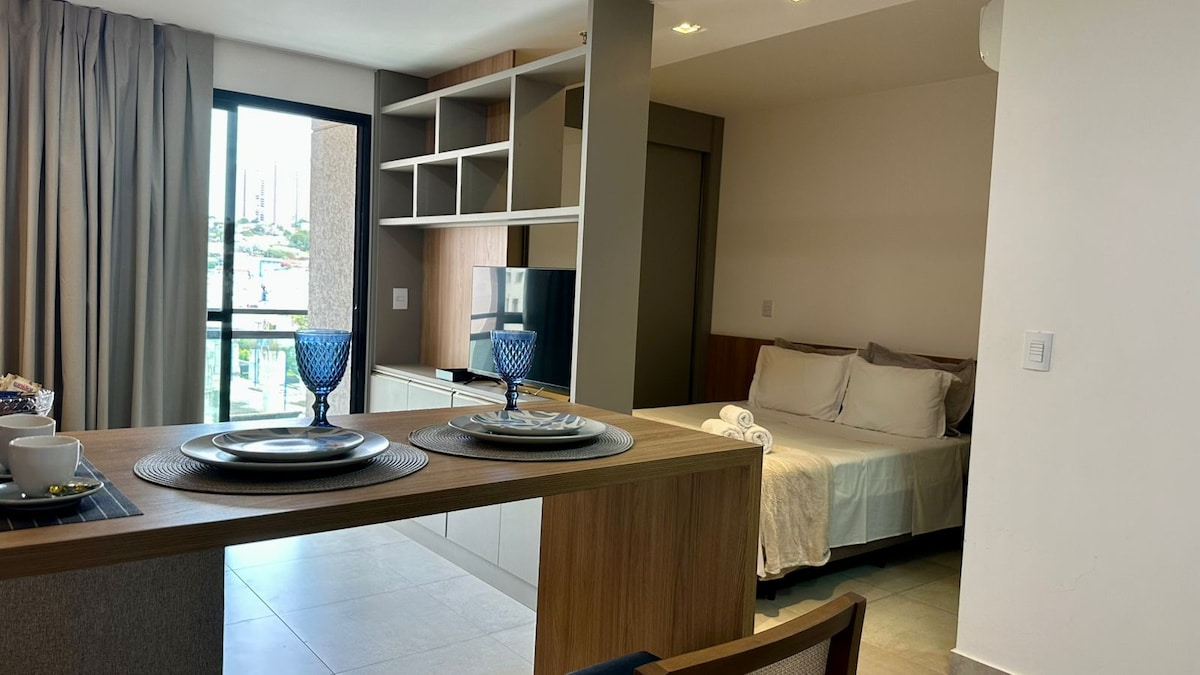 Apartamento Studio novo e moderno localizado em região nobre de Ribeirão Preto , conta com Wi-Fi , ar condicionado , cozinha completa , smart Tv 40’ , Academia BlueFit no prédio , Air fryer , vaga de garagem e área de lazer completa , piscina , sauna , salão de jogos , espaço gourmet , espaço coworking para trabalho , home market 24h e a melhor localização da cidade , na avenida Presidente Vargas a 3 minutos do Ribeirão shopping e próximo aos melhores parques , bares e restaurantes de Ribeirão.