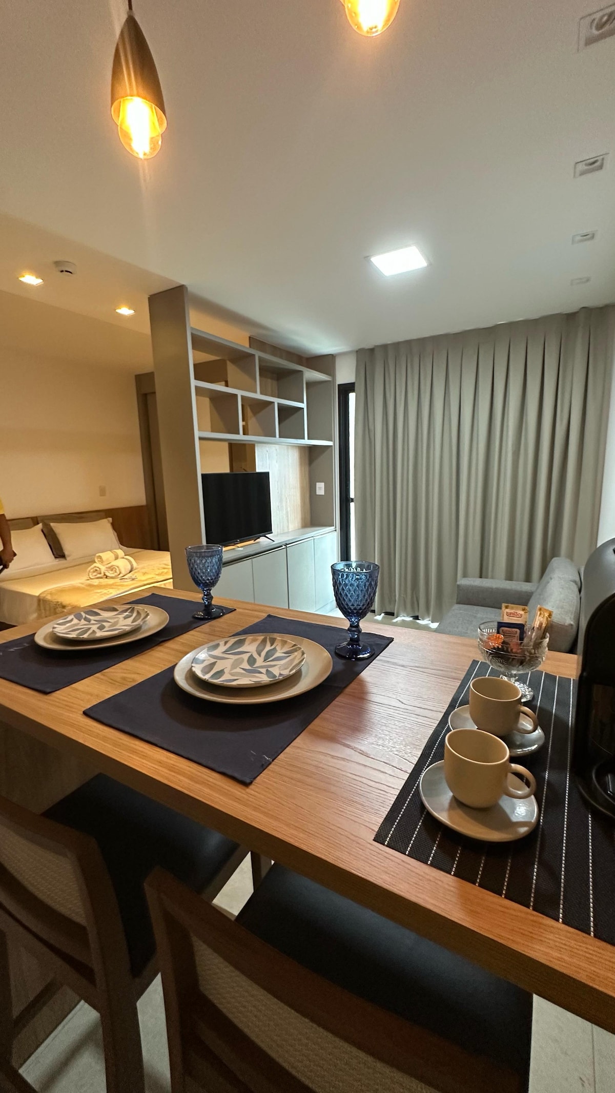 Relaxe neste lugar único e tranquilo. Studio completo com Wi-Fi, smart Tv, AC, Alexa, utensílios de cozinha, cafeteira, filtro de água, secador de cabelo, ferro de passar e tudo mais para o seu conforto. Você pode optar por 2 camas de solteiro ou 1 cama queen. Desfrute das áreas comuns como piscina, elevador, estacionamento, lavanderia, portaria 24h, sala para estudos ou reuniões e espaço gourmet. Excelente localização, próximo ao Hospital São Francisco e Faculdade UNAERP.