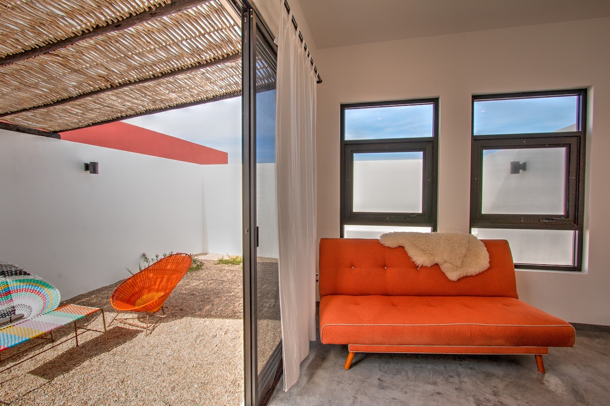 Relájate en este espacio tan tranquilo, ecologico y elegante. Sumergito en la naturaleza del desierto esta cabaña ofrece relax, total privacidad y desconexión de la vida caotica y turistica en un ambiente donde el unico sonido es el cantos de los pajaros. Estando retirado de las luces de la calle en la noche se pueden observar millones de estrellas, asi como amaneceres y atardeceres desde la teraza con vista mar y desierto. Estamos dentro de un area residencial segura.