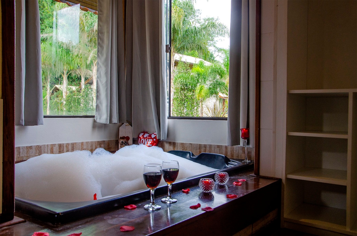 O chalé é composto por cama Queen, banheira de hidromassagem, ar condicionado, wifi, frigobar, microondas, cafeteira, copos, pratos e talheres, além de banheiro privativo.