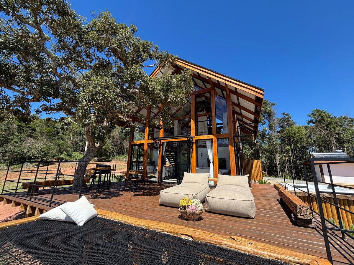 Inspirado nos chalés americanos e canadenses típicos da região do Alaska, o Chalé foi feito todo em madeira rústica, e decorado com todo luxo e design para que o hóspede tenha uma experiência inesquecível com requinte e aconchego. O chalé foi pensado para enquadrar a vista mata e é inserido em uma área verde privativa de 4 mil m² com dois poços naturais com acesso exclusivo dos hóspedes. Nos arredores do chalé você também pode aproveitar cachoeiras, trilhas, bares e restaurantes.