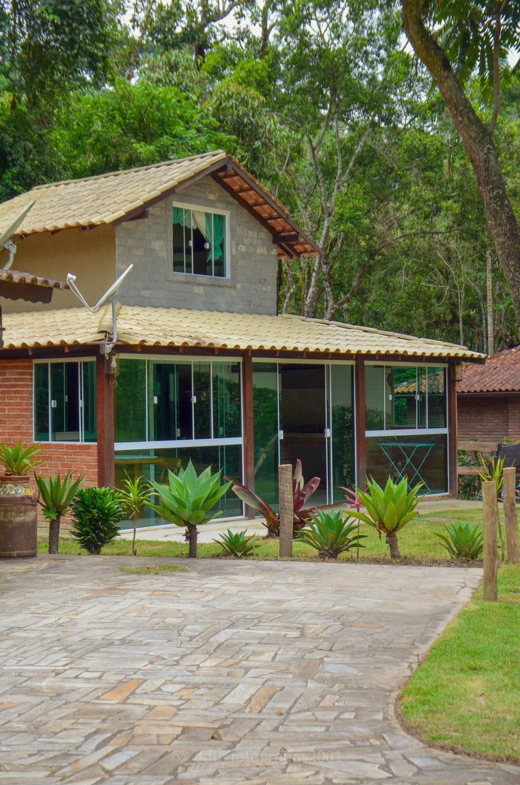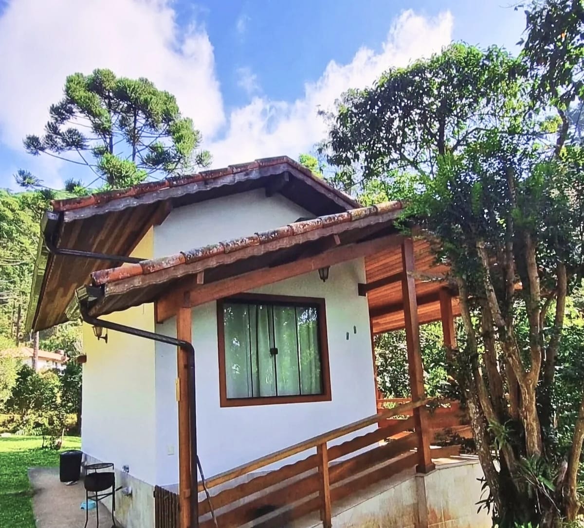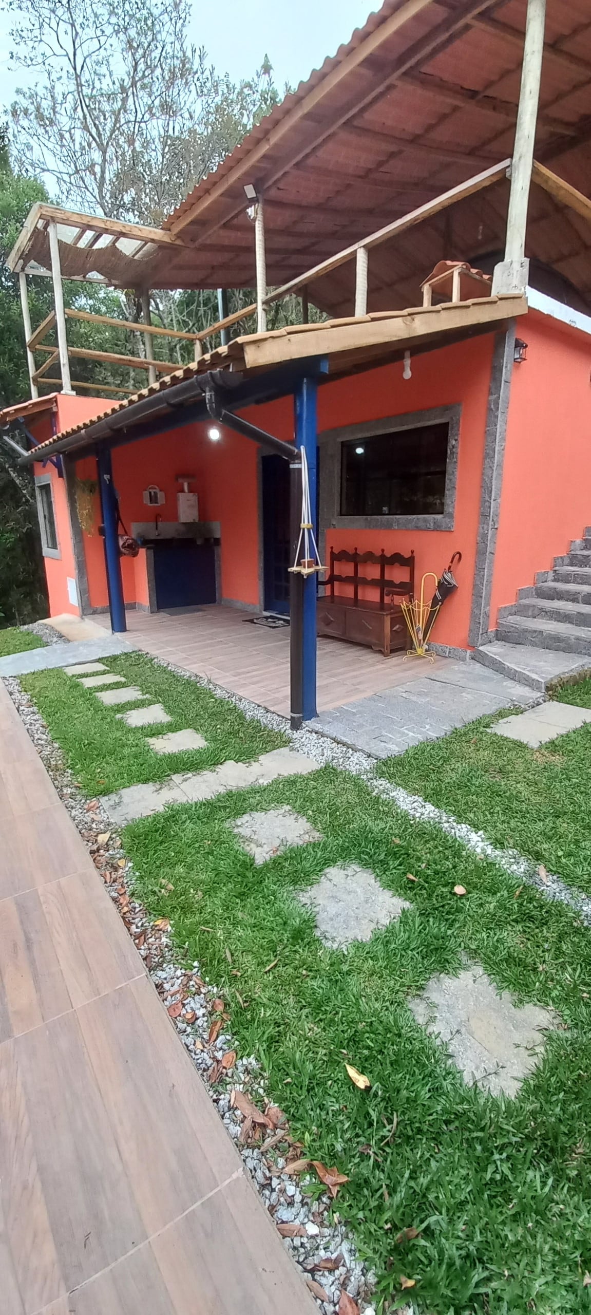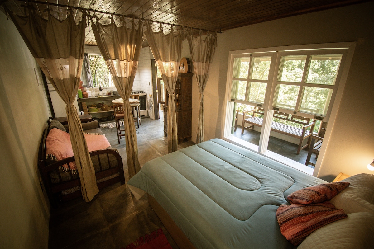 O chalé fica no jardim da minha casa. O rio das Pedras, cristalino, atravessa o jardim com uma sauna á margem. Tem sala, varanda dando para a mata, com rede, cozinha equipada, bom banho quente, e um mezanino - pequeno, não se fica em pé nele, mas bem arejado (duas janelas), com colchão de casal. So é possivel uma pessoa extra (colchonete na sala). Lareira, lenha que for necessaria. Boa Net. O ambiente da mata é úmido, desaconselhável para quem tem alergia. Mercado entrega. Uber nós atende.