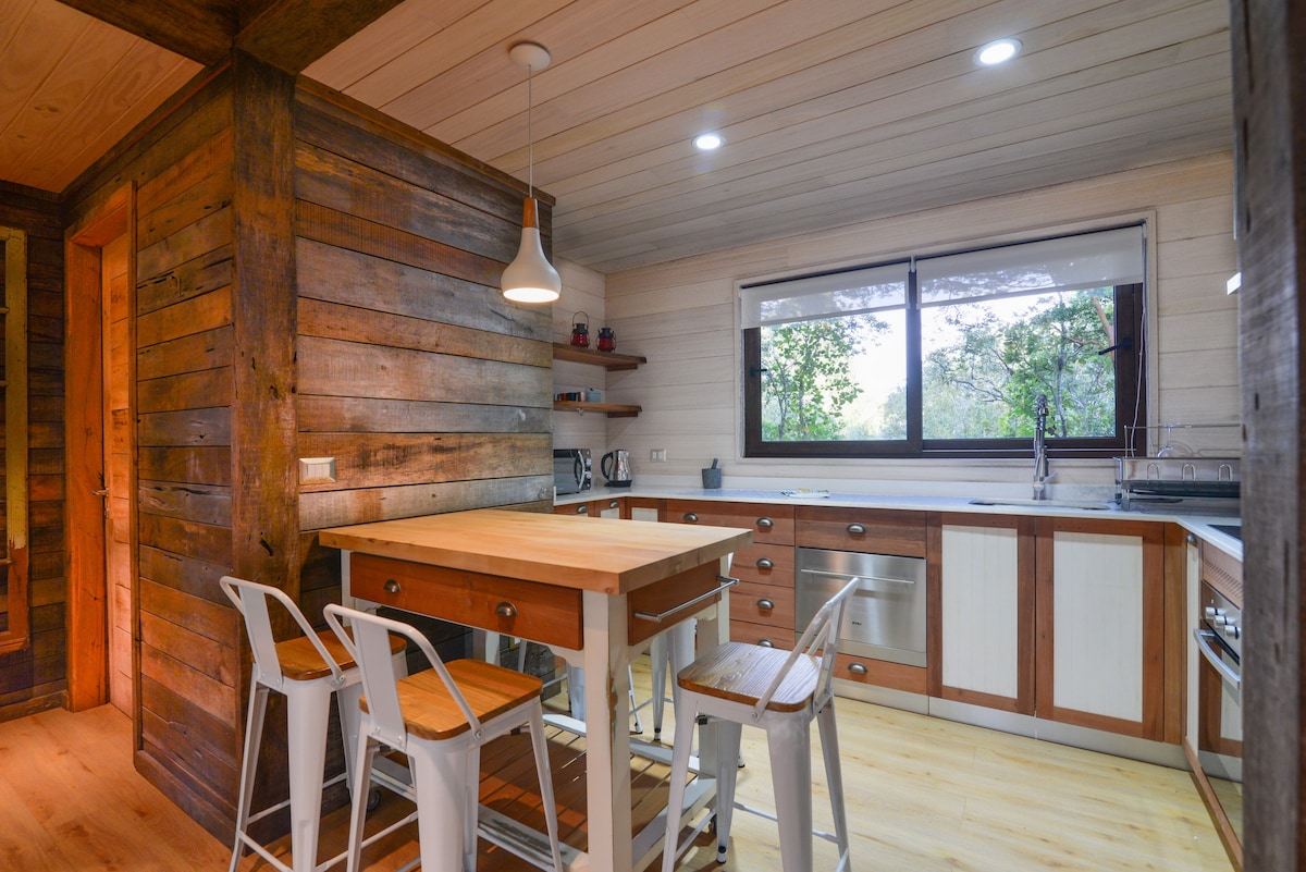 The cabin has a natural feel and rustic touch within amazing surroundings of the native forest and trees all around you. The cabin has been built with native and sustainable wood. it is well equipped. Is very cute and cozy space with a large veranda with an outdoor seating. There is a nice river with access within the property with a picnic table next to it to enjoy listening the river. Big sunny green garden, picnic table to enjoy the view of the mountains, a fire-pit and couple of hammocks.