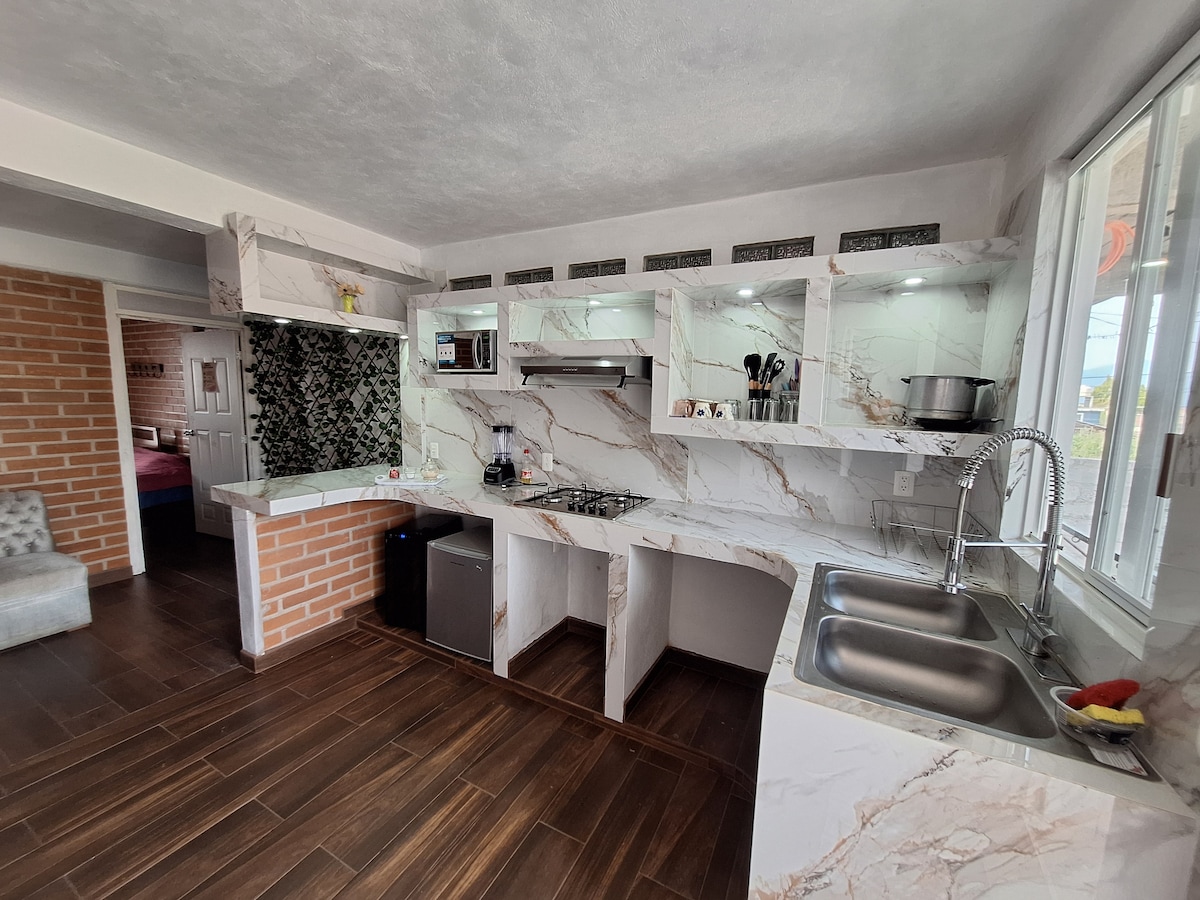 Suite de 90 mts2 , para disfrutar en pareja, de estilo mexicano contemporáneo, con grandes ventanales y con vista espectacular al volcán Popocatépetl e Iztaccíhuatl y cerro de San Miguel. Ubicada en zona urbana del pueblo mágico de Atlixco, a 10-15 minutos del centro y lugares recreativos. "El Mirador" está decorado con detalles que lo hacen muy acogedor , cuenta con todo lo básico para pasar un romántico fin de semana con un jacuzzi para dos personas, espacio ideal para descansar y disfrutar.