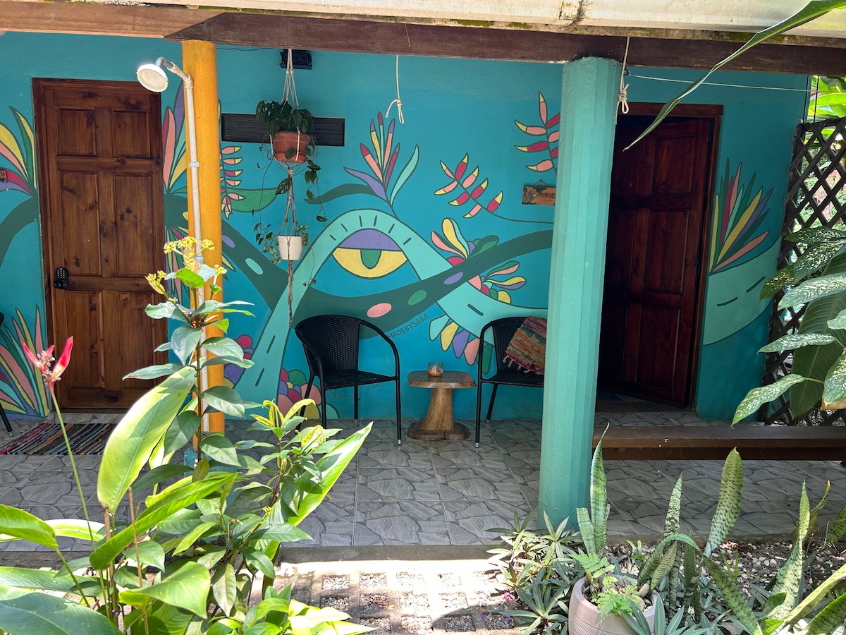 Located at La Junta on the Rio Baru in the heart of Dominical, less than 5 minute walk to the beach with secure off street parking, our Cabinas are the perfect place for your Pacific Coast stay. Relax on the hammock, hang with the macaws, eat a mango; Surf the big waves or get a massage; eat good food and enjoy all that our jungle beach town has to offer. Our little piece of paradise is ready for you!