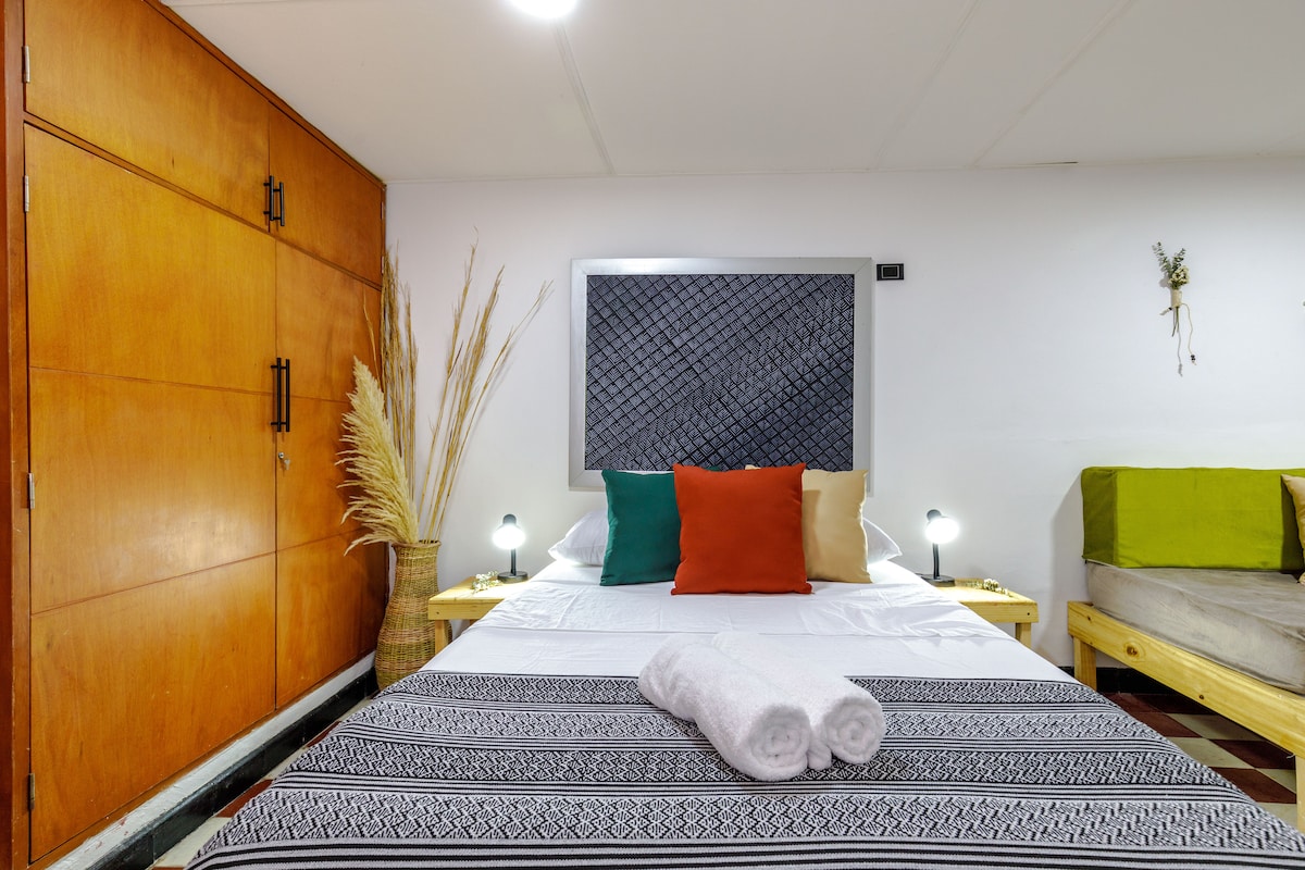 Artisan cabana built with natural materials in the Kogui tradition. 1st floor - table, chairs & 2 hammocks for relaxing + full bathroom. 2nd floor - circular sleeping space w double bed & bunk beds. Spacious & peaceful, this cabana offers a balcony with rocking chairs where you can gaze at the night sky. Mosquito netting provided. Zaino entrance to Tayrona National Park, pharmacies, restaurants & bus stops are a 5-10 min walk. Breakfast & bike rentals available upon request.