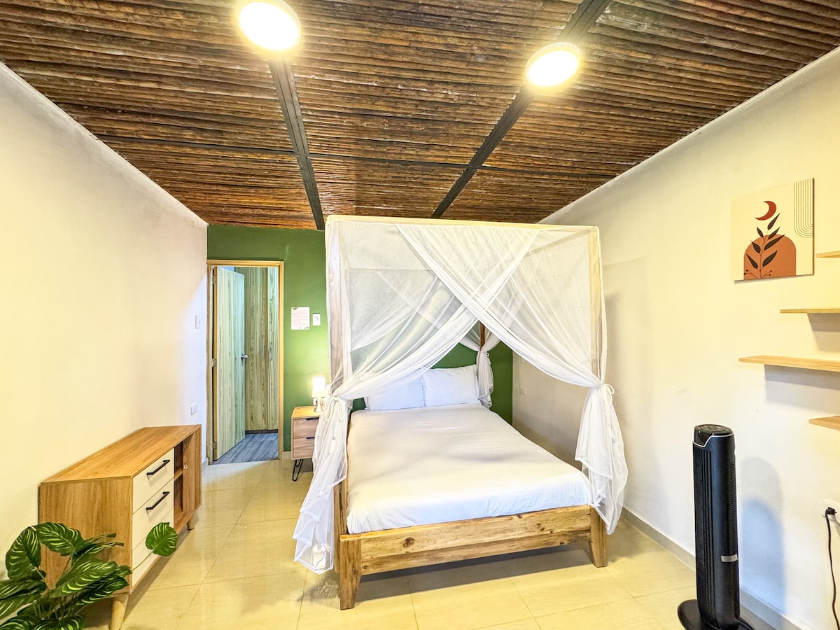 Habitación para pareja, con baño privado, aire acondicionado y hermosa vista hacia el mar. tendrás acceso a toda nuestra zona social. Perfecto espacio para disfrutar de unas vacaciones con tu pareja contagiándote de la buena energía de casa Babel, un lugar de hermosos atardeceres. Couple room with private bathroom, AC and a fantastic view to the sea. You can enjoy about all our common areas in the hotel. (Pool, big hammock, bar, relaxing living room and rooftop)