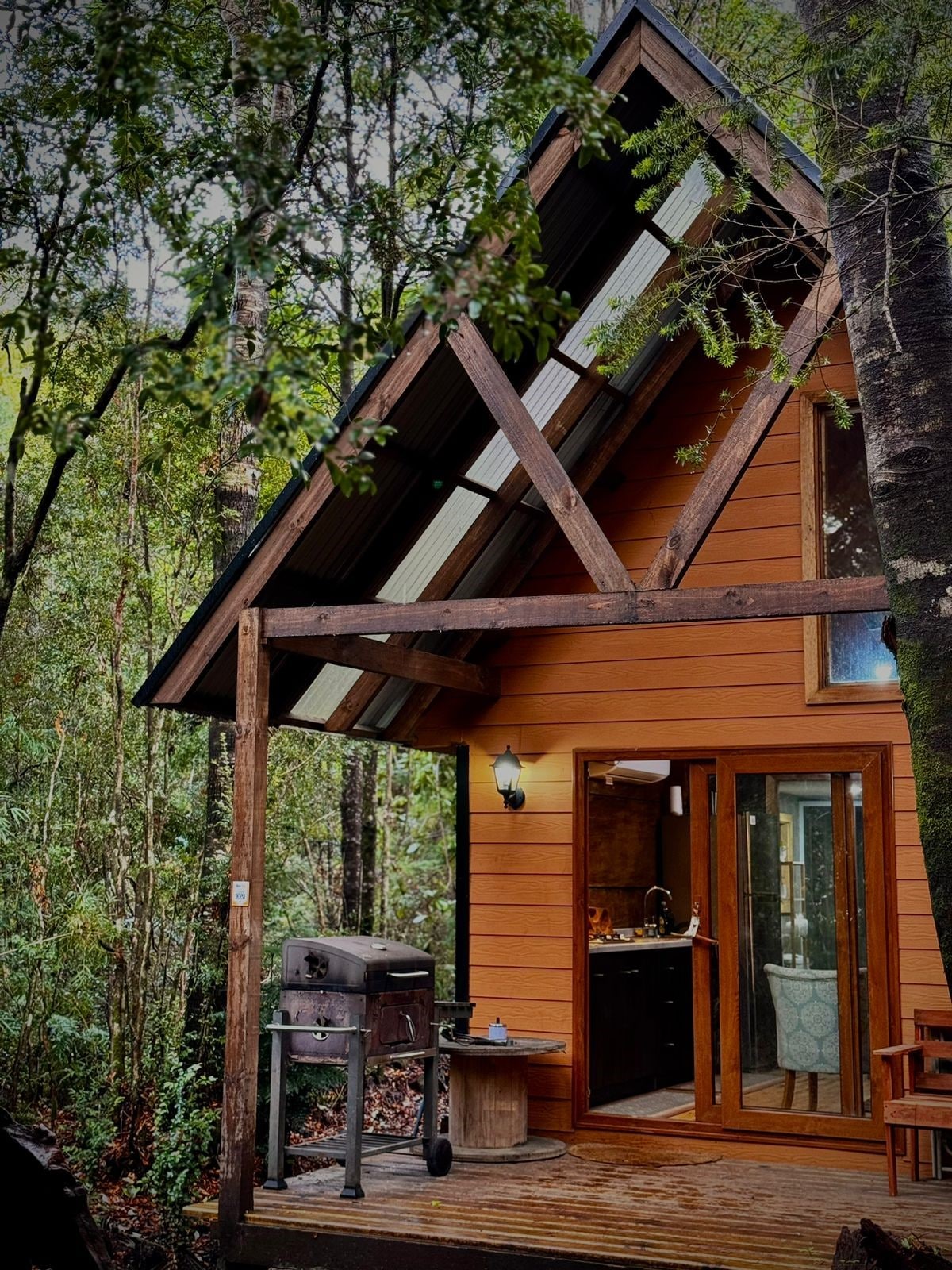 Es una cabaña rústica tipo Tiny house(cabaña pequeña) sustentable para 2 personas. MUY IMPORTANTE :No tiene tv, cuenta con un pequeño frigobar, secador de pelos, cuenta con cocina a leña y aire acondicionado frío calor. Cuenta con una tina caliente tiene costo extra de $40.000 pesos. Rodeada de árboles nativos fué construida tratando de mantener el equilibrio con el alrededor. Hay un fogón al aire libre. A 1 kilómetro y medio está el pueblo de Río Puelo y a 3 kilómetros de las Termas del Sol