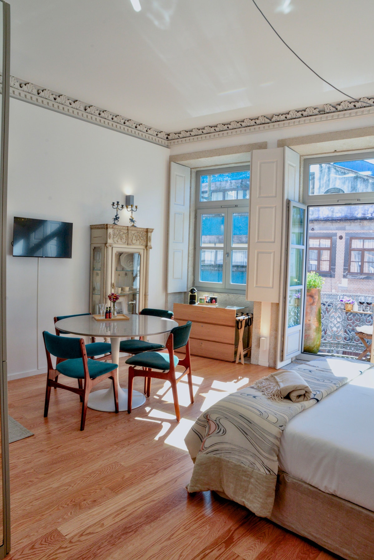 Stay in a stylish one bedroom apartment in a historic Porto building, just steps from Clérigos Tower and Cordoaria and Virtudes Gardens. Enjoy a balcony with sweeping views over the Douro River - perfect for relaxing after a day of exploring. Like many heritage buildings, there’s no lift and a unique 0.5 bathroom design (private toilet + open sink & shower), adding to its charm. Surrounded by cafés, shops and landmarks it’s the perfect setting for friends and couples to fall in love with Porto.