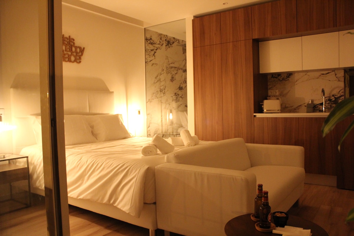 Luxurious studio apartment located in the absolute center of downtown Faro. In this brand new apartment, guests will be able to experience high end materials and furnishings, bright and ample areas, absolute privacy, a picturesque furnished balcony, a fully equipped kitchen and bar area, and the convenience of being steps away from the marina, bars, cafes, restaurants, a supermarket and all transportation options, making this one of the most coveted apartments in Faro.