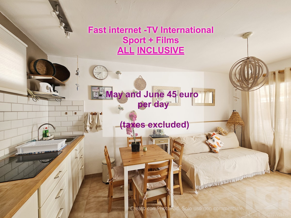 This independent flat is very quiet and fully equipped, inside a newly renovated resort built on the ashes of the historical old building known as "Hotel Corralejo", the famous hotel which was the hype in the 70s. The flat is on the ground floor; there are one bedroom, one living room and one bathroom. The terrace, facing the backyard and two pools - one of which is a jacuzzi, has a table, chairs and a cozy couch to eat outside or just chill and relax after a day spent at the sea or exploring.