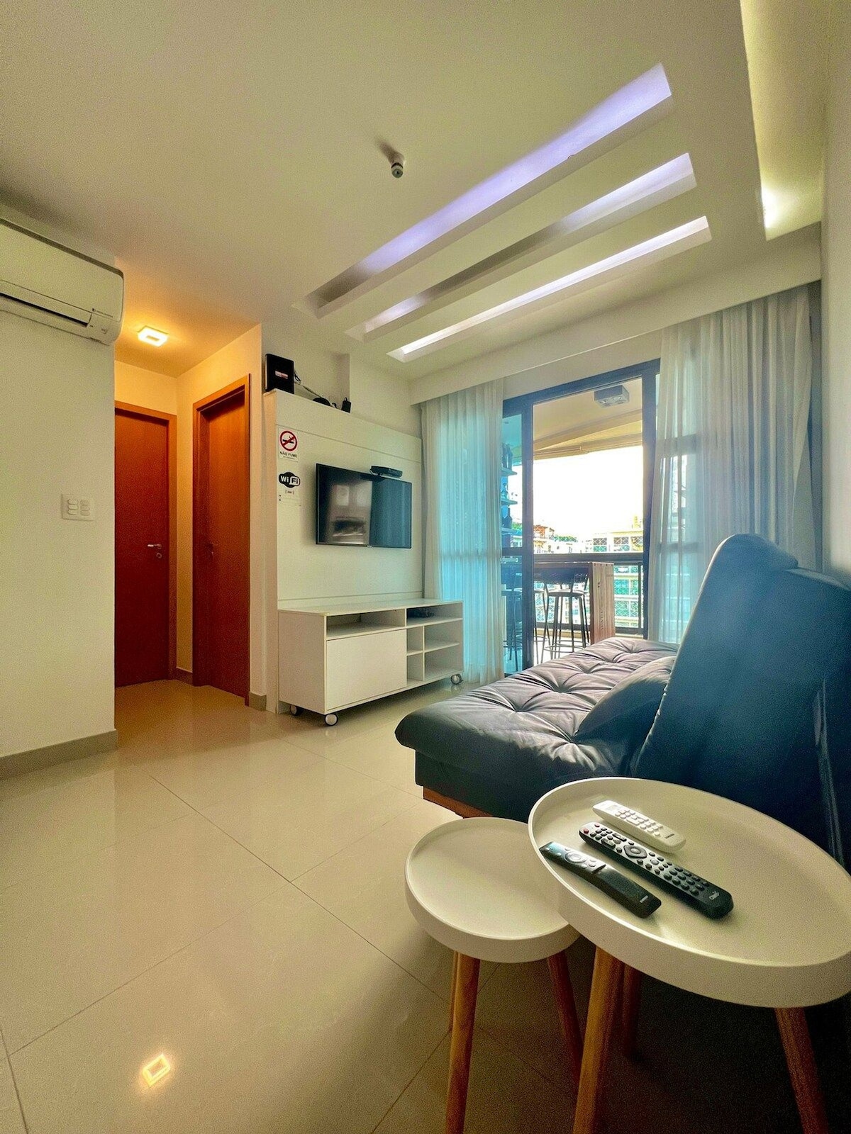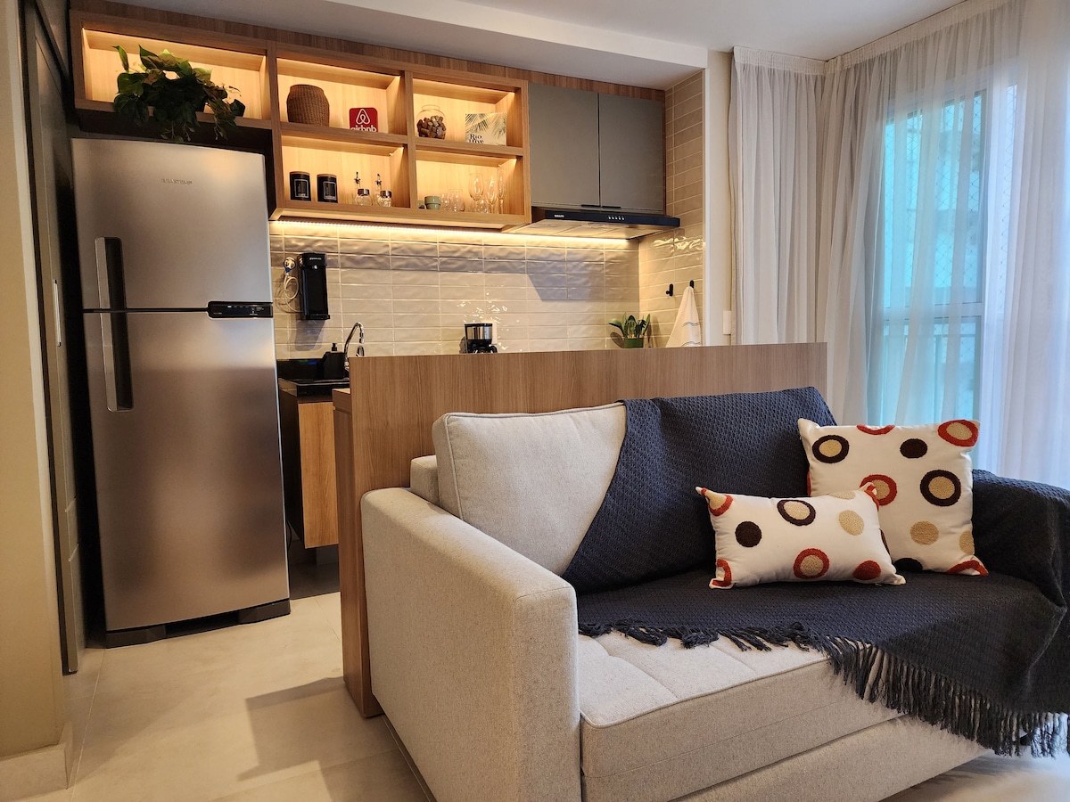 O apartamento é claro, arejado e cuidadosamente preparado para oferecer conforto. Dispõe de duas camas de solteiro que podem ser unidas, formando uma cama de casal, além de TV a cabo, ar-condicionado, armários e cozinha equipada com frigobar, micro-ondas, cafeteira, filtro de água, fogão de indução e sanduicheira. Ideal para quem viaja a lazer ou a trabalho. O condomínio oferece infraestrutura de excelência, com piscina, sauna, academia e restaurante.