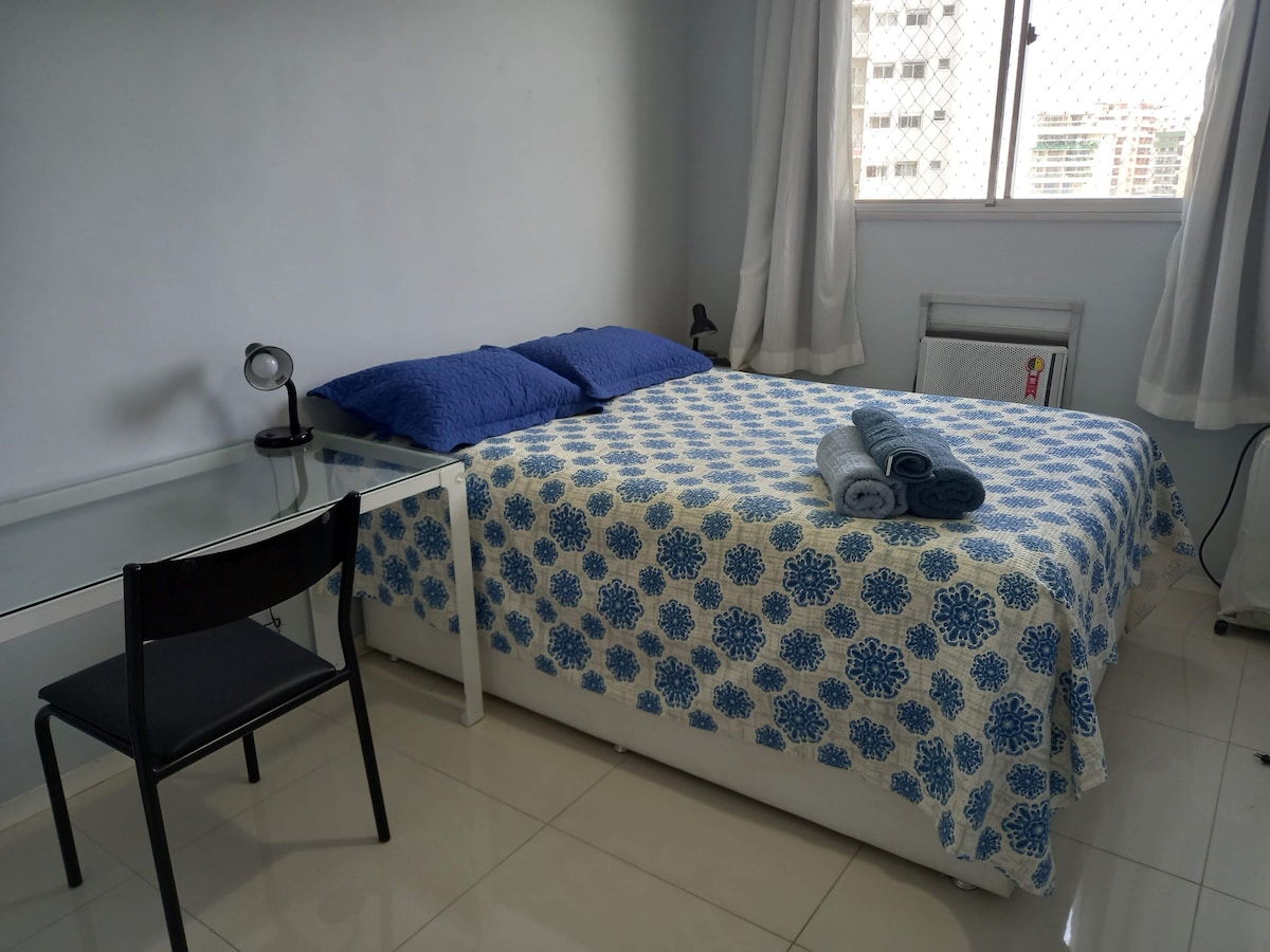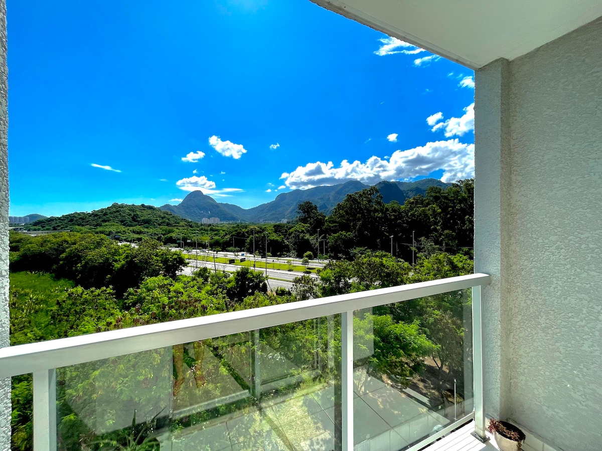 SINTA-SE EM CASA! Aconchegante apartamento de 2 quartos no 7º andar (com rede de proteção) com estacionamento gratuito. Smart tv no local e wifi (excelente velocidade de conexão). NÃO POSSUI AR CONDICIONADO. Local próximo a bares, shoppings a céu aberto, farmácias, supermercados, Mc Donald's, Lojas Americanas e Projac. 20 min da Praia da Barra e do Recreio. Apartamento em frente ao Riocentro (só atravessar a rua), Parque Olímpico e Jeunesse Arena. AS COMODIDADES ESTÃO MAIS ABAIXO NO ANÚNCIO