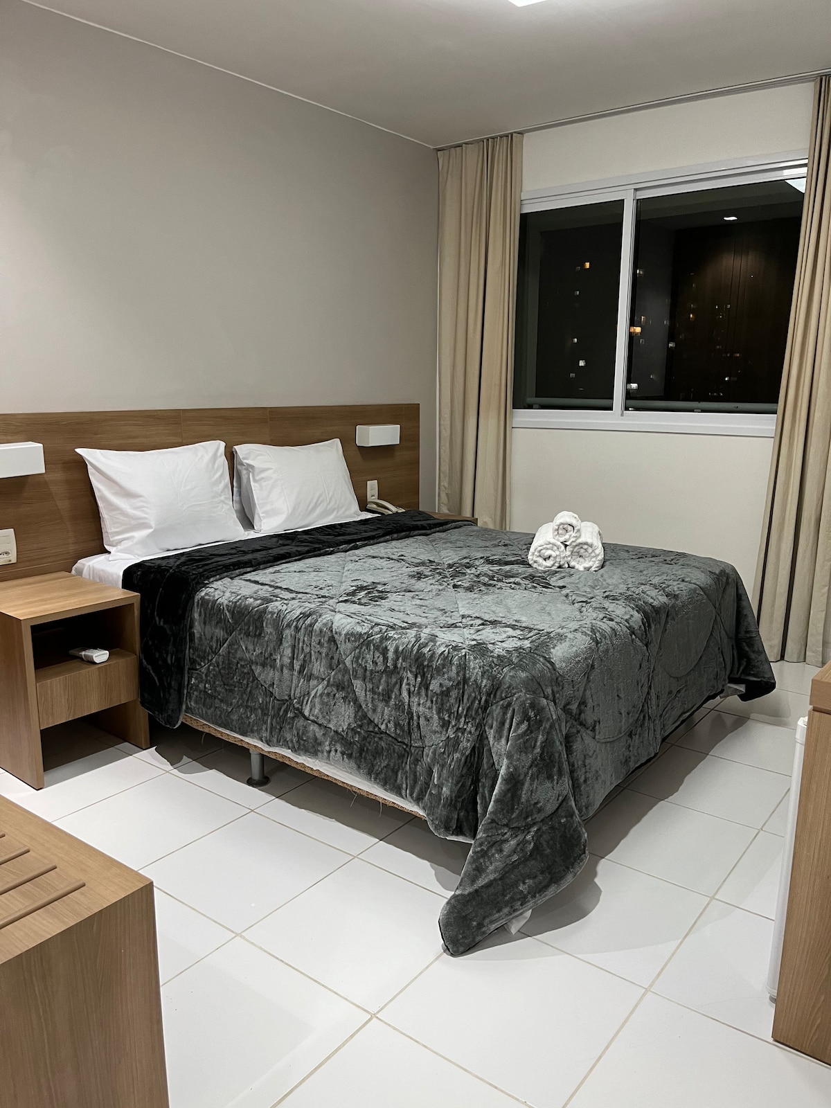 O apartamento é claro, arejado e cuidadosamente preparado para oferecer conforto. Dispõe de duas camas de solteiro que podem ser unidas, formando uma cama de casal, além de TV a cabo, ar-condicionado, armários e cozinha equipada com frigobar, micro-ondas, cafeteira, filtro de água, fogão de indução e sanduicheira. Ideal para quem viaja a lazer ou a trabalho. O condomínio oferece infraestrutura de excelência, com piscina, sauna, academia e restaurante.