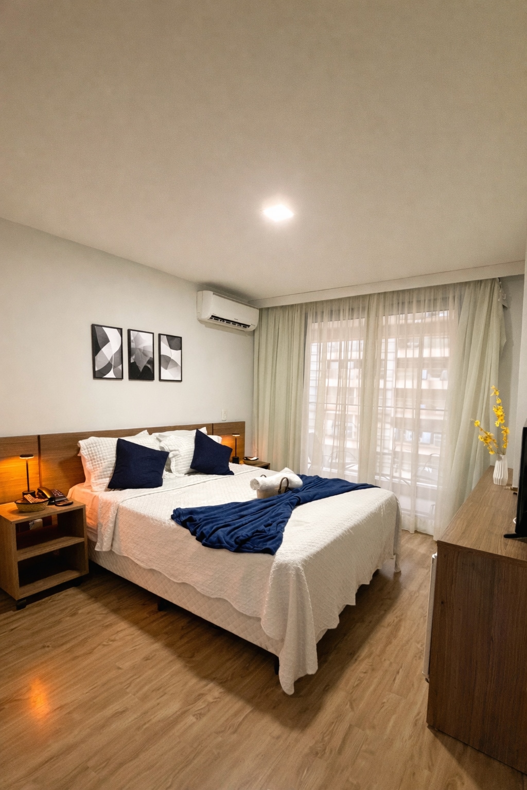 Acolhedor Flat em andar alto, bem arejado, silencioso e indevassável Internet 250MB exclusiva Filtro de água instalado No quarto, Cama King Size. Na sala, Sofá-Cama. Total privacidade entre os ambientes Silenciosos ar condicionados Split, cofre digital, TV Smart 58 canais, cozinha e lavanderia completas: cafeteira, sanduicheira, liquidificador, ferro, lavadora e utensílios Piscina com hidromassagem, sauna, academia, salão de jogos Micro market na recepção para sua conveniência