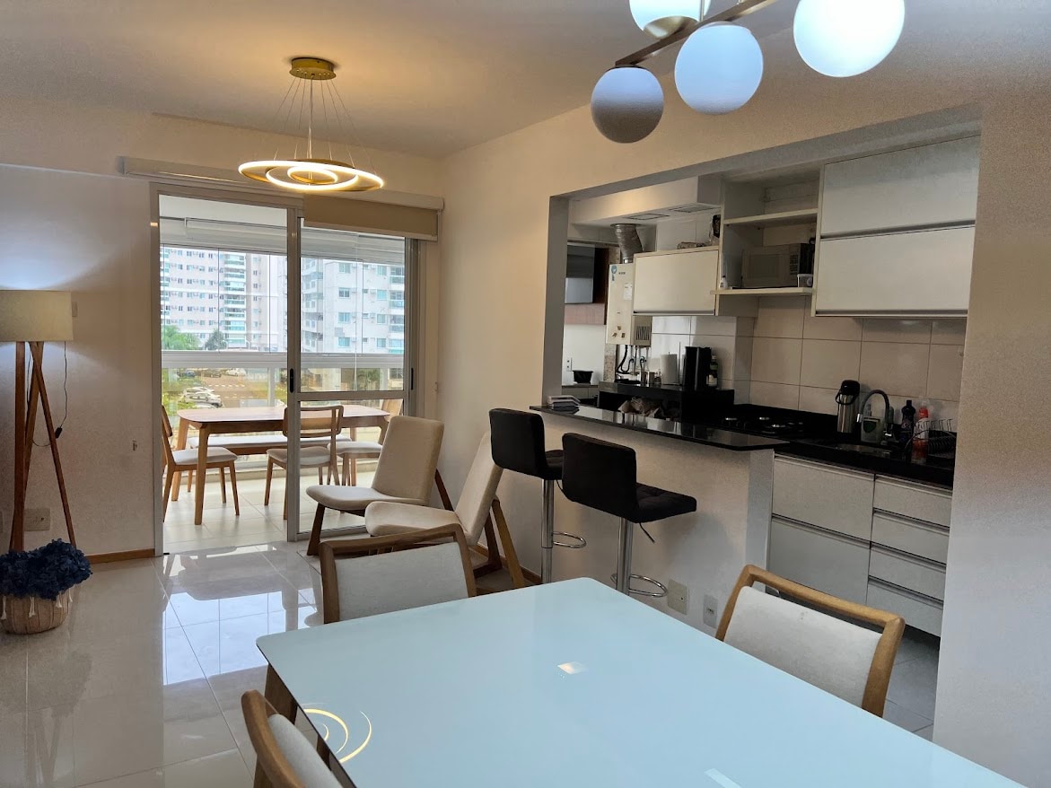 Apartamento totalmente mobiliado com ar condicionado em ambiente de sala e quarto , TV, Wi-Fi cozinha completa com fogão , geladeira, microondas, utensílios de cozinha em geral, máquina de lavar e secar roupas. Disponibilizamos roupas de cama e banho. Composto por uma suíte de casal , um banheiro social , um escritório que pode ser revertido em quarto com sofá cama para casal , sala de jantar e estar em ambiente conjugado. Disponibilizamos para as famílias com bebês um berço portátil.