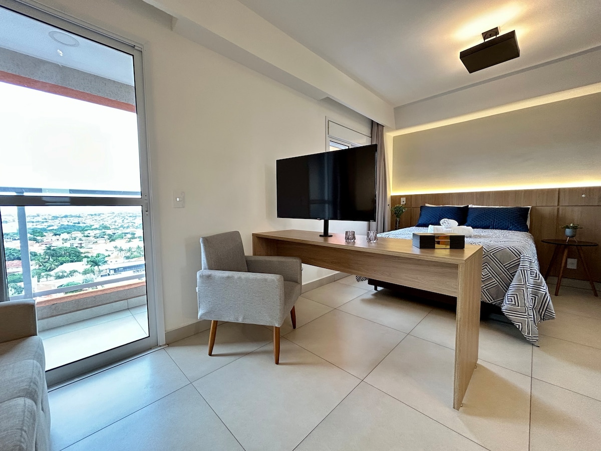 Studio with air conditioning, wi-fi, 50' smart TV, queen bed and parking space in the building's parking lot. Building with excellent structure (swimming pool, Blue Fit gym, 24-hour market, home-office space, etc.), with concierge and 24-hour security team. Privileged location in the South Zone, on one of its main avenues (1.5km from Ribeirão Shopping; 2.5km from Botafogo Stadium; and close to several renowned bars/restaurants in the city). *Included: bed and bath linen.