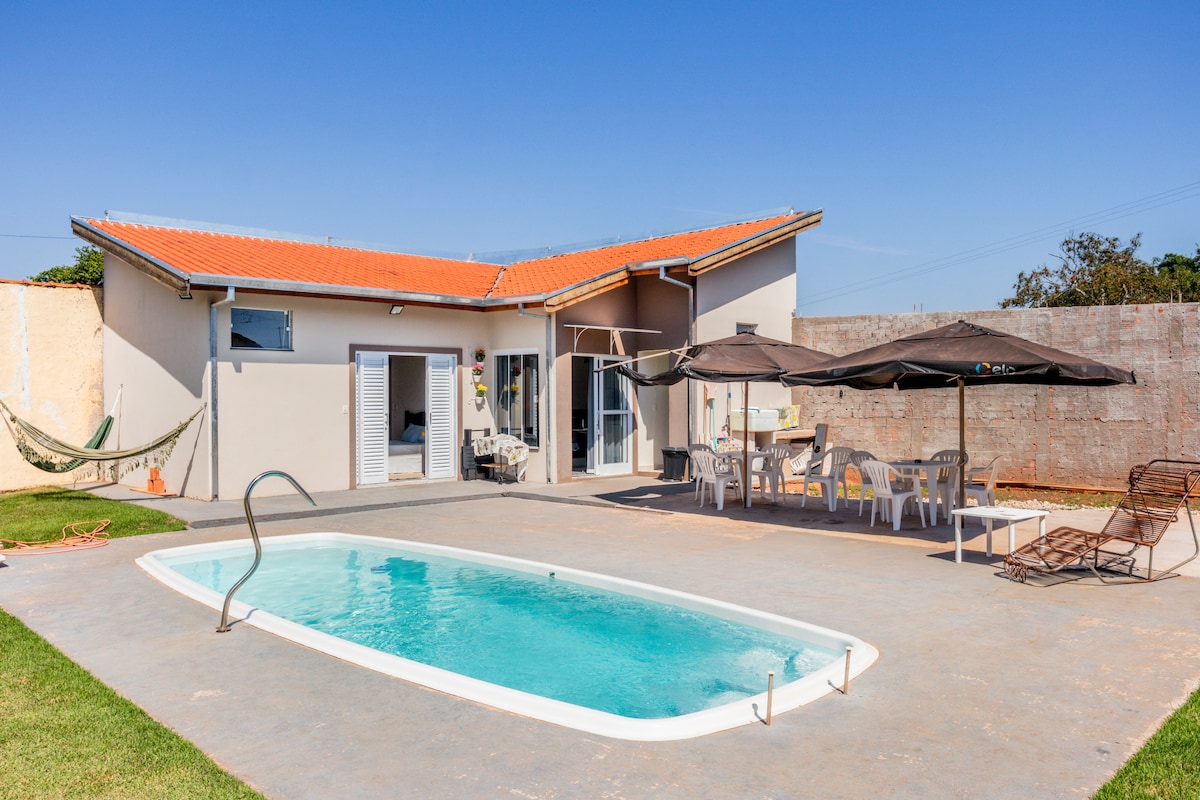 Casa com piscina, churrasqueira interna e externa, 2 banheiros (1 externo), quarto 1 com cama de casal e solteiro, quarto 2 com cama de solteiro e Casal,ventiladores de teto nos quartos, microondas, geladeira, fogão, TV de LED, utensílios domésticos, garagem para 3 carros,Internet Wi-Fi, ótima localização em bairro residencial nobre. Aceito animais de pequeno porte com amplo quintal ideal para momentos em família