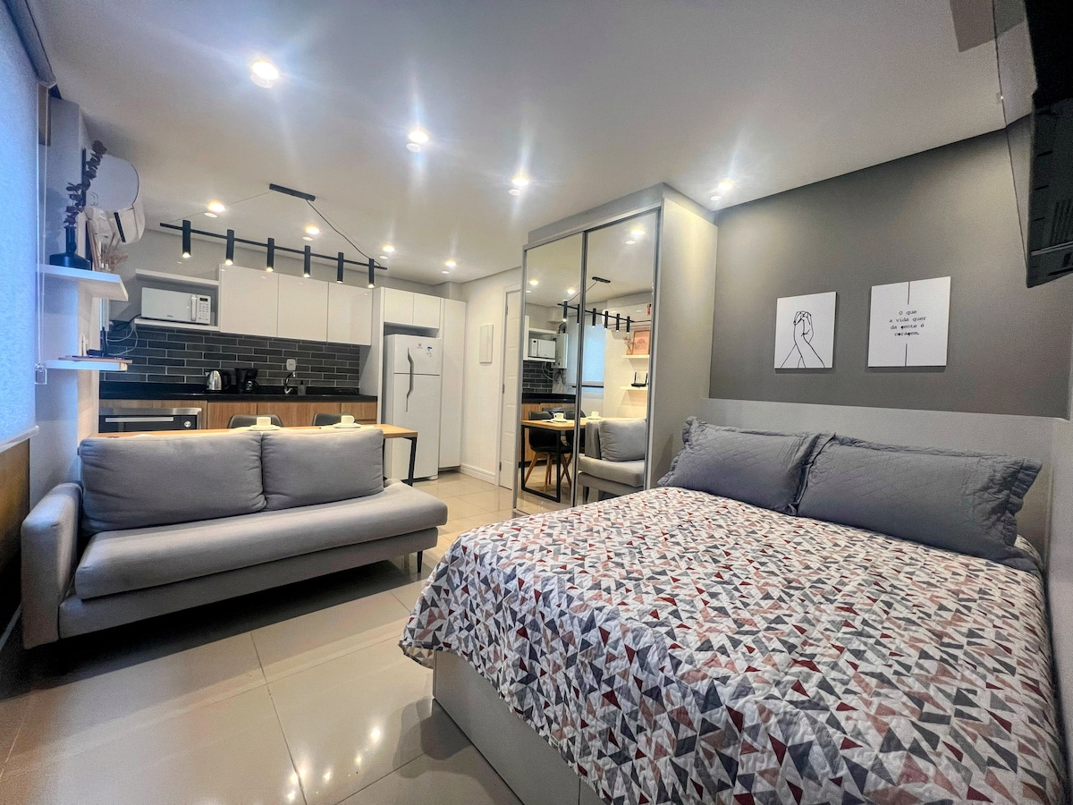 Brand new studio 43sqm in TREND CITY, amazing panoramic view (16th floor) to Guaíba Lake, Lake Shore and Marinha Park, condominium with complete infrastructure, concierge 24h, parking space, gym, 20m heated pool. Queen size beds, space to work with laptop, hot and cold air-conditioning 24,000, Smart TV 50, cable TV NET HD with 250 channels, Wi-Fi 250 mbps, barbecue pit, wash and dryer machine, iron, hair dryer, microwave, airfryer, tag and electronic lock.