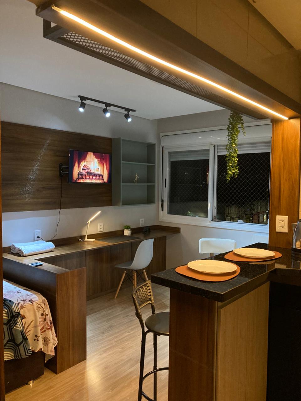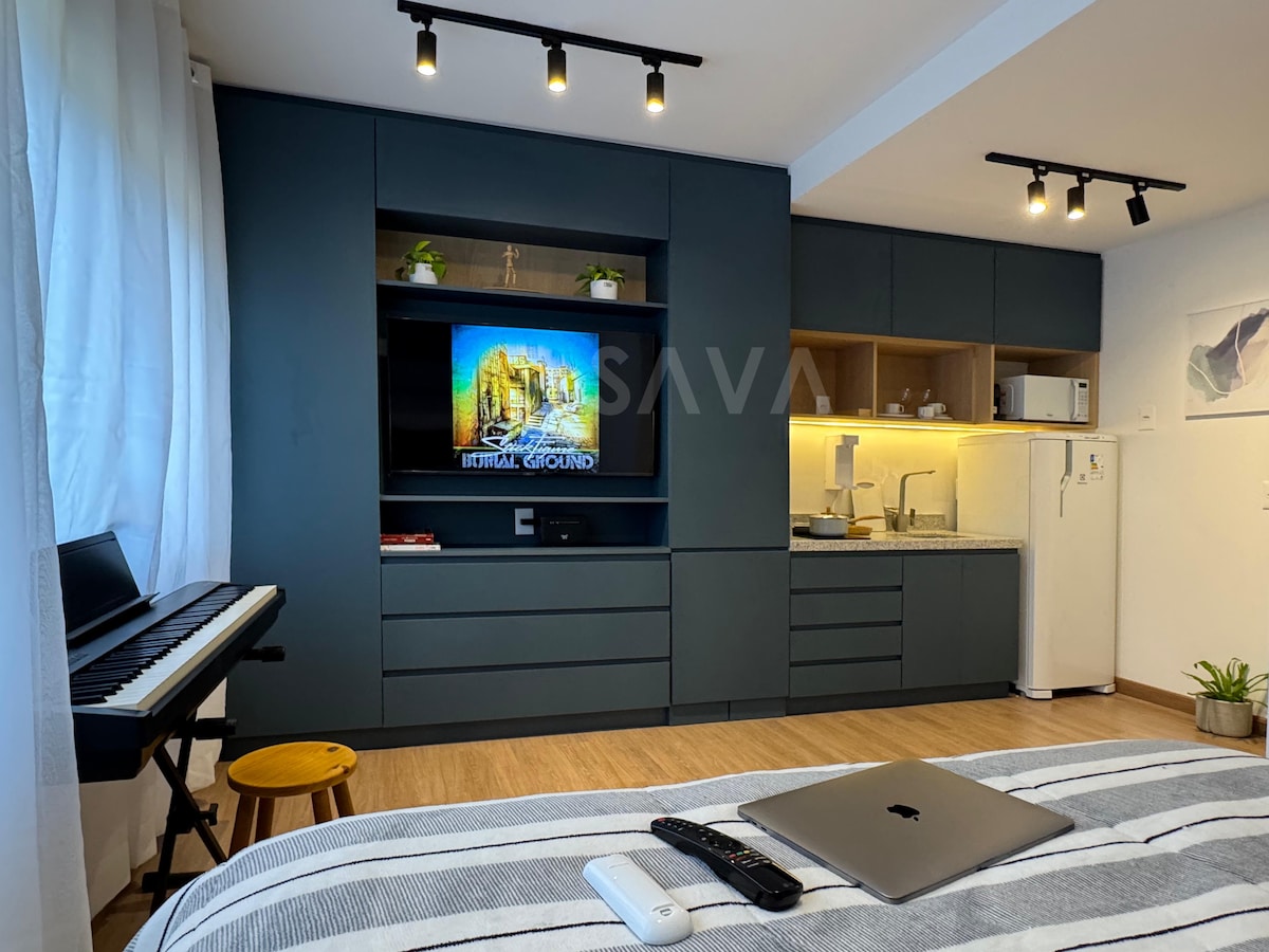 Viva uma experiência única neste estúdio acolhedor e elegante, projetado com atenção aos detalhes para oferecer conforto, funcionalidade e muito estilo. O ap azul planejado é um diferencial exclusivo, com iluminação suave e decoração pensada para relaxar, móvel inteligente e versátil que se transforma em mesa de jantar ou apoio para cozinhar — perfeito para quem valoriza funcionalidade. Piano digital disponível para relaxar, praticar ou se inspirar. Smart TV, Wi-Fi.
