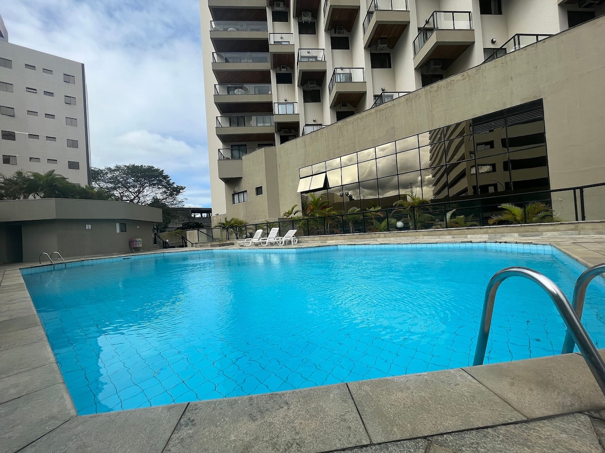 Espaço gostoso e aconchegante para individual ou casal. Portaria 24 horas. Ar condicionado no quarto. Localizado em frente ao shopping Colinas. Supermercado Tauste com ótimos preços bem pertinho, Assai atacadista e Pão de Açúcar. Dá para ir a pé. Tem também farmácia e padaria, próxima. Oba hortifrutis no bairro. Mac Donald na mesma calçada.